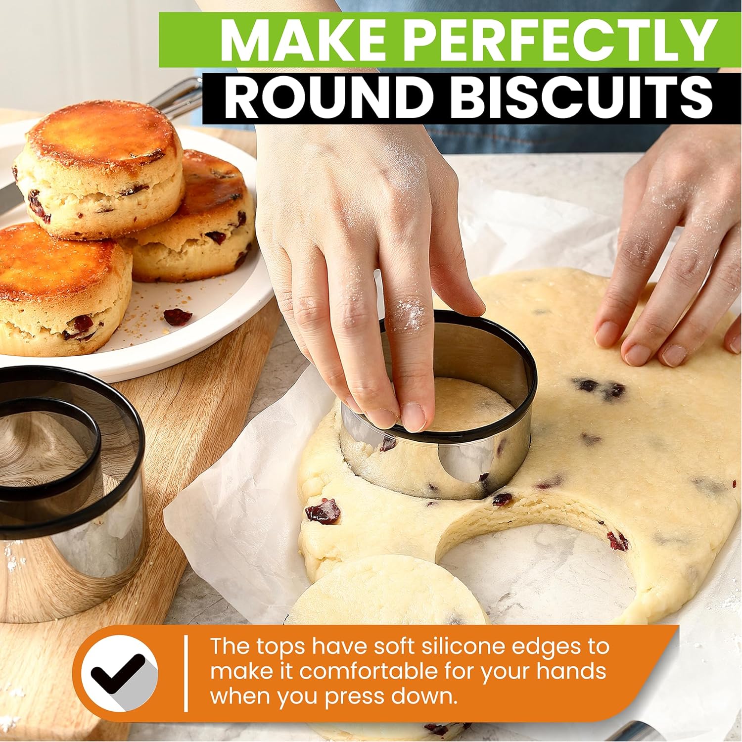 - Includes 4 Piece Stainless Steel Biscuit Cutter Set - Quickly make perfectly round biscuits that can pass as store-bought with this premium set of 1", 2", 3" and 3.5" cutters. The tops have soft silicone edges to make it comfortable for your hands when you press down.