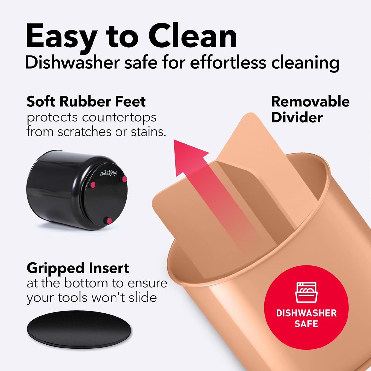 - CLEANING IS A BREEZE - Other metal utensil holders can rust and stain your counters with ugly spots over time, or they can scratch your countertops. Our cutlery holder has rubberized feet to ensure that it won't harm your counter or slide around, and is completely RUST-PROOF. The divider and gripped insert are easily removable, for hassle-free cleaning. The whole utensil crock is 100% DISHWASHER SAFE!