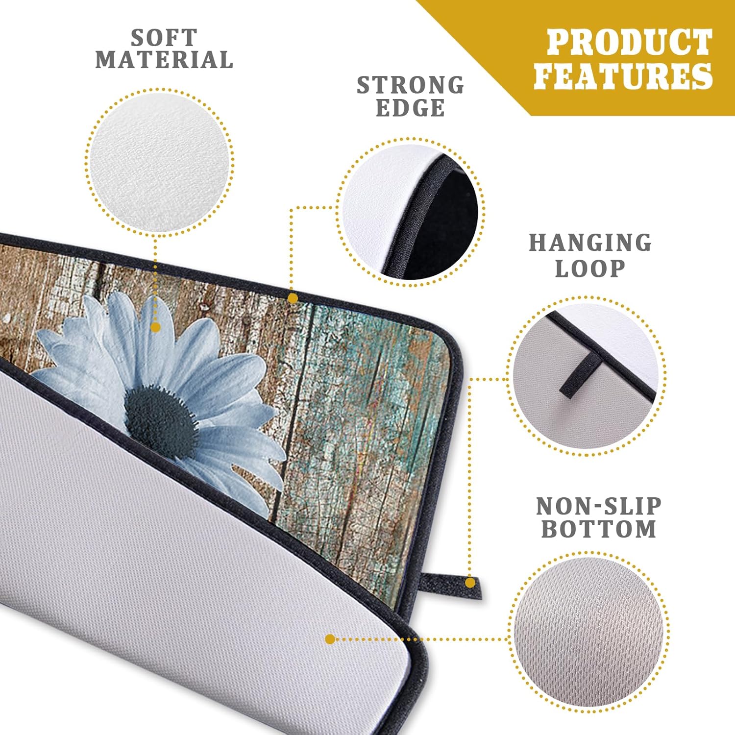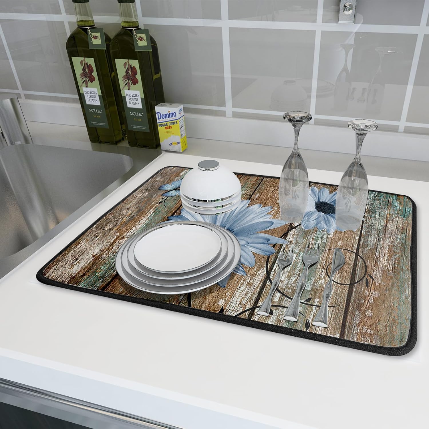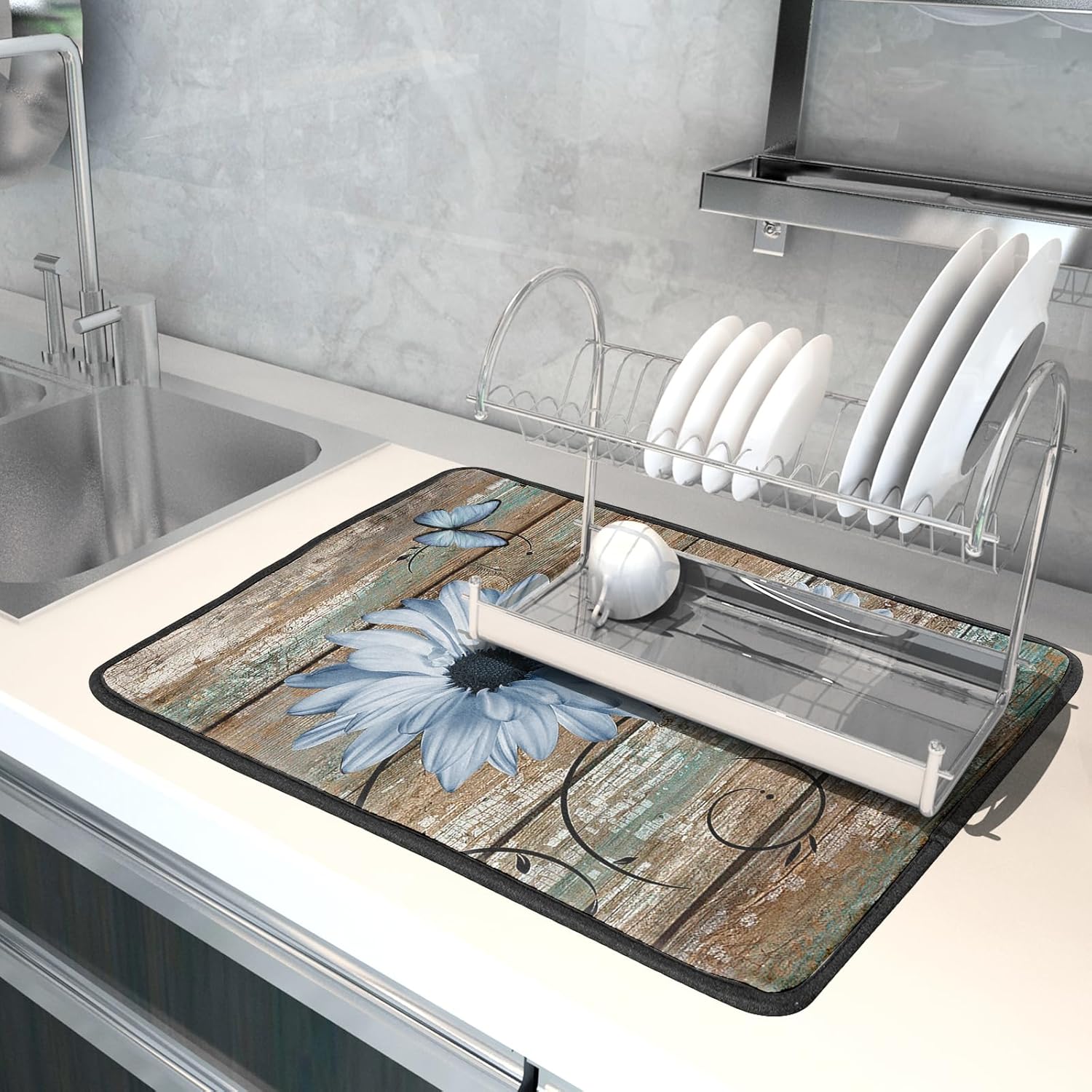 Rustic Daisy Dish Drying Mat for Kitchen Countertop 18x24 inch Blue Sunflowers on Wooden Board Dish Drainer Mats Fast Drying Country Vintage Style Shabby Chic Flower Dish Drying Pad Decor Large