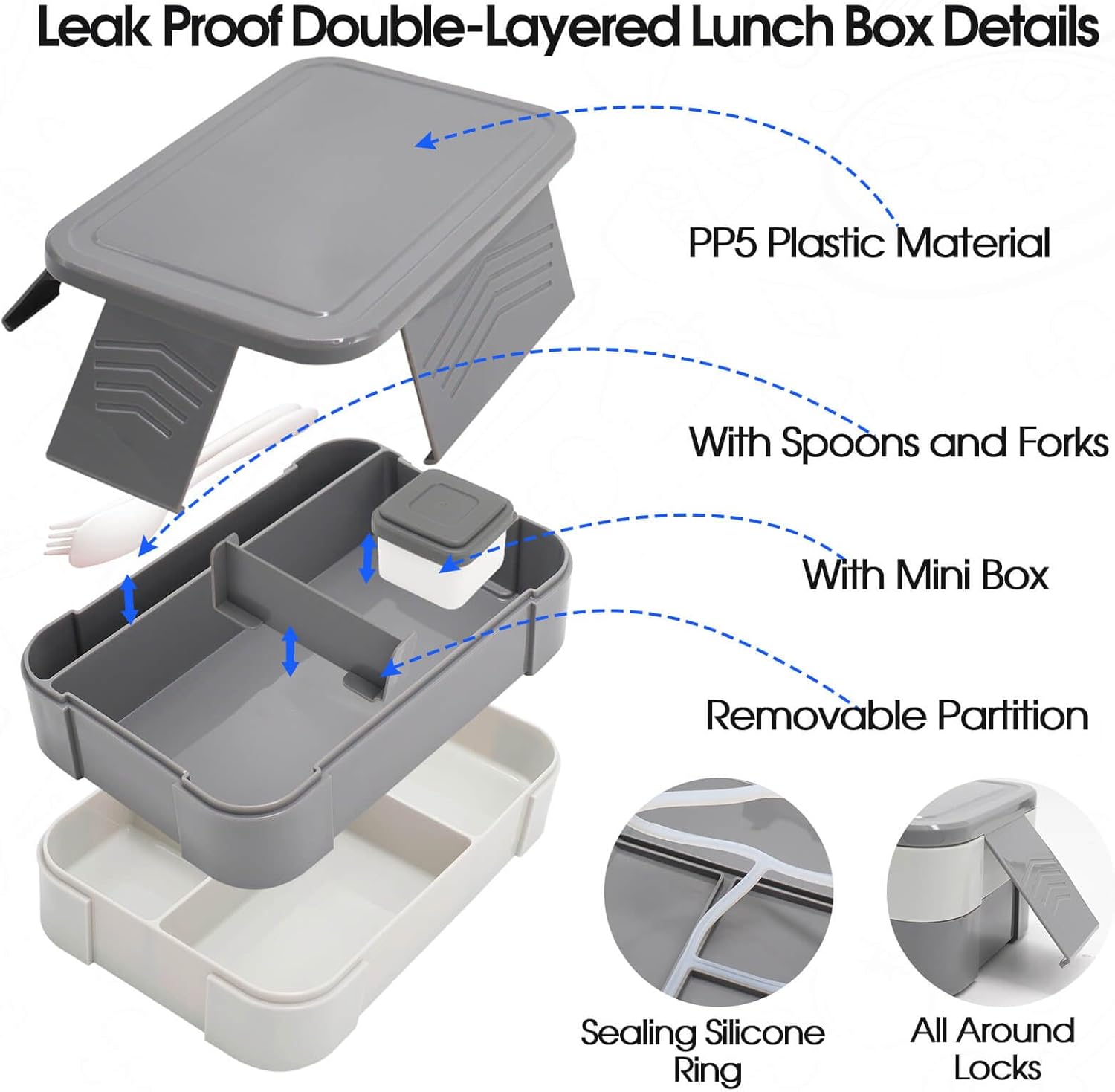 - 🖤 The bento lunch box for kids measures 7.6 x 5.3 x 3.2 inches, has 6 compartments, big enough to hold your child's lunch, and comes with cutlery and sauce cups for you to enjoy delicious food. The bento lunch box is made of PP5 plastic, which is safe and reliable and can be washed in the dishwasher.