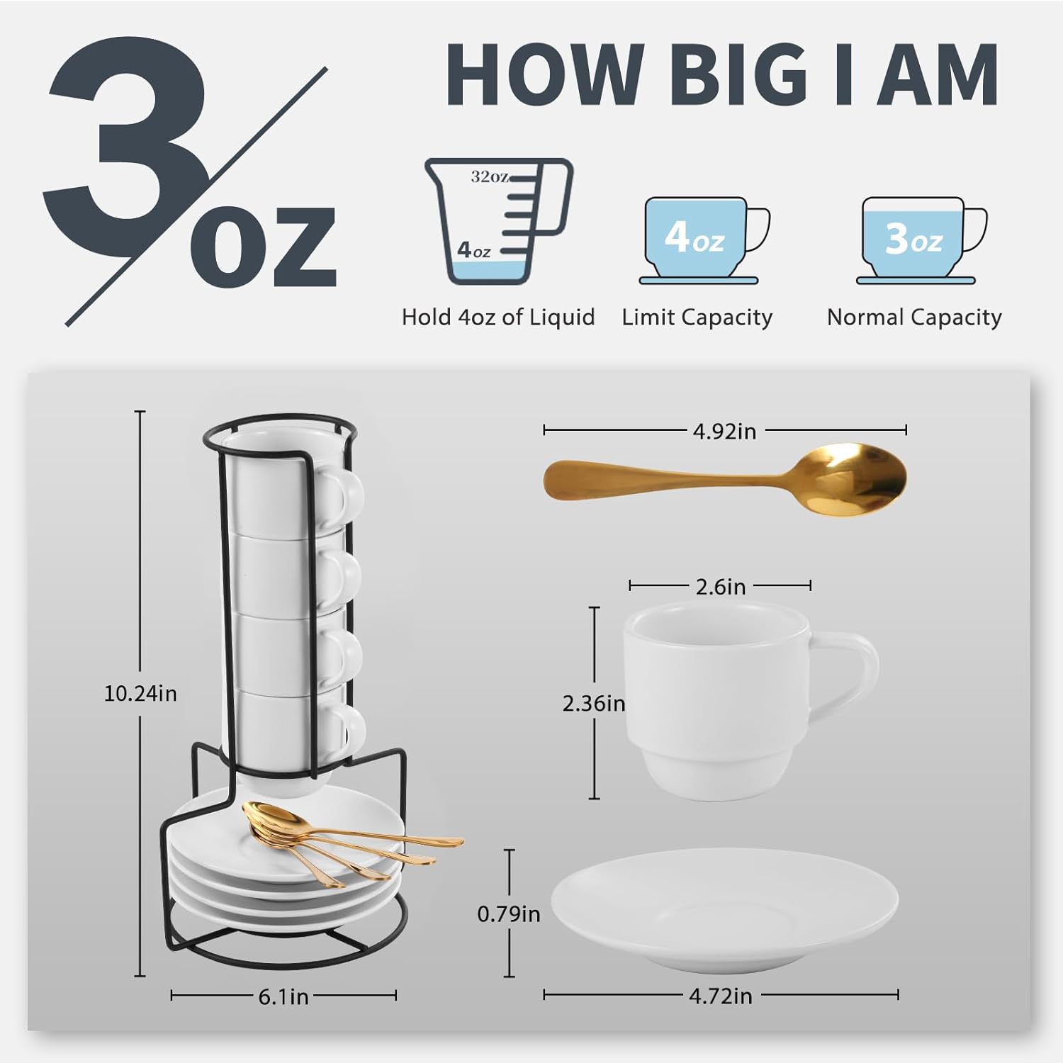 Lareina 3-Ounce Espresso Cups with Saucers, Spoons and Metal Stand, Small Stackable Coffee Cups Set of 4, Ceramic Demitasse Mugs, White