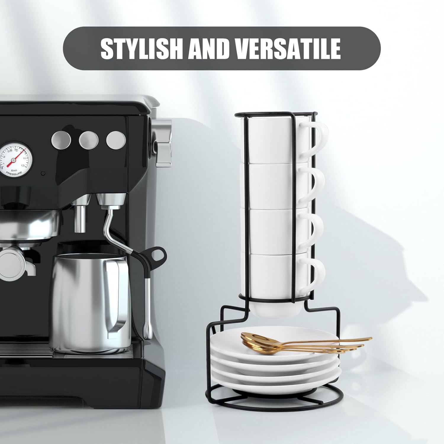 - Multi-functional Set: We've thoughtfully included saucers and spoons with each set of cups, making it convenient for you to enjoy your coffee without worrying about dirtying the table or searching for a coffee stirring tool. Plus, we've added a metal rack as a bonus, allowing you to easily organize this entire set of small coffee mug