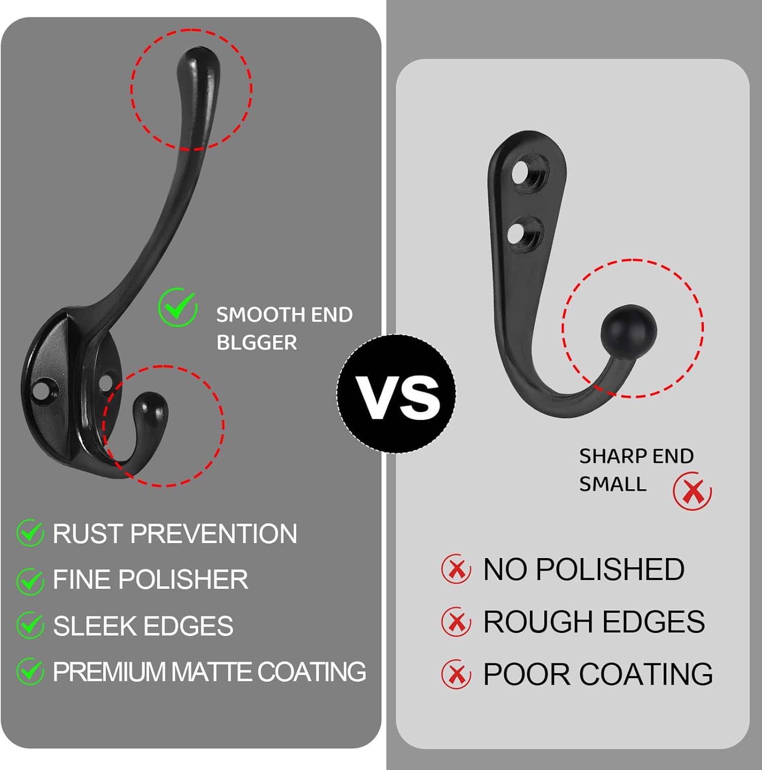 - 【Package and Size】closet hooks Set includes 10pcs double coat hooks and 20pcs screws Measures 3.9 inches*2.2 inches*1.2 inches.