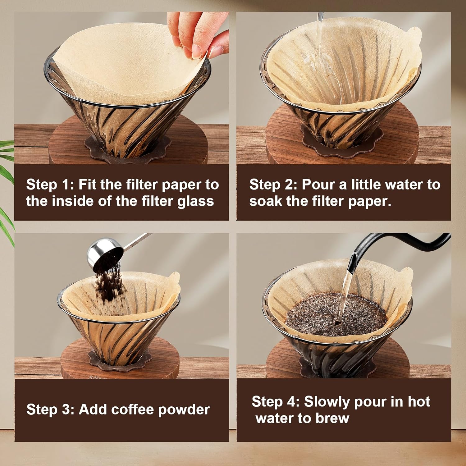 - [Product List]: This pour over coffee set includes 100 v60 coffee filters, a pour over coffee dripper, a wooden base, a glass lid and a sharing pot. This 5-in-1 set can fulfill your hand brewed coffee needs.