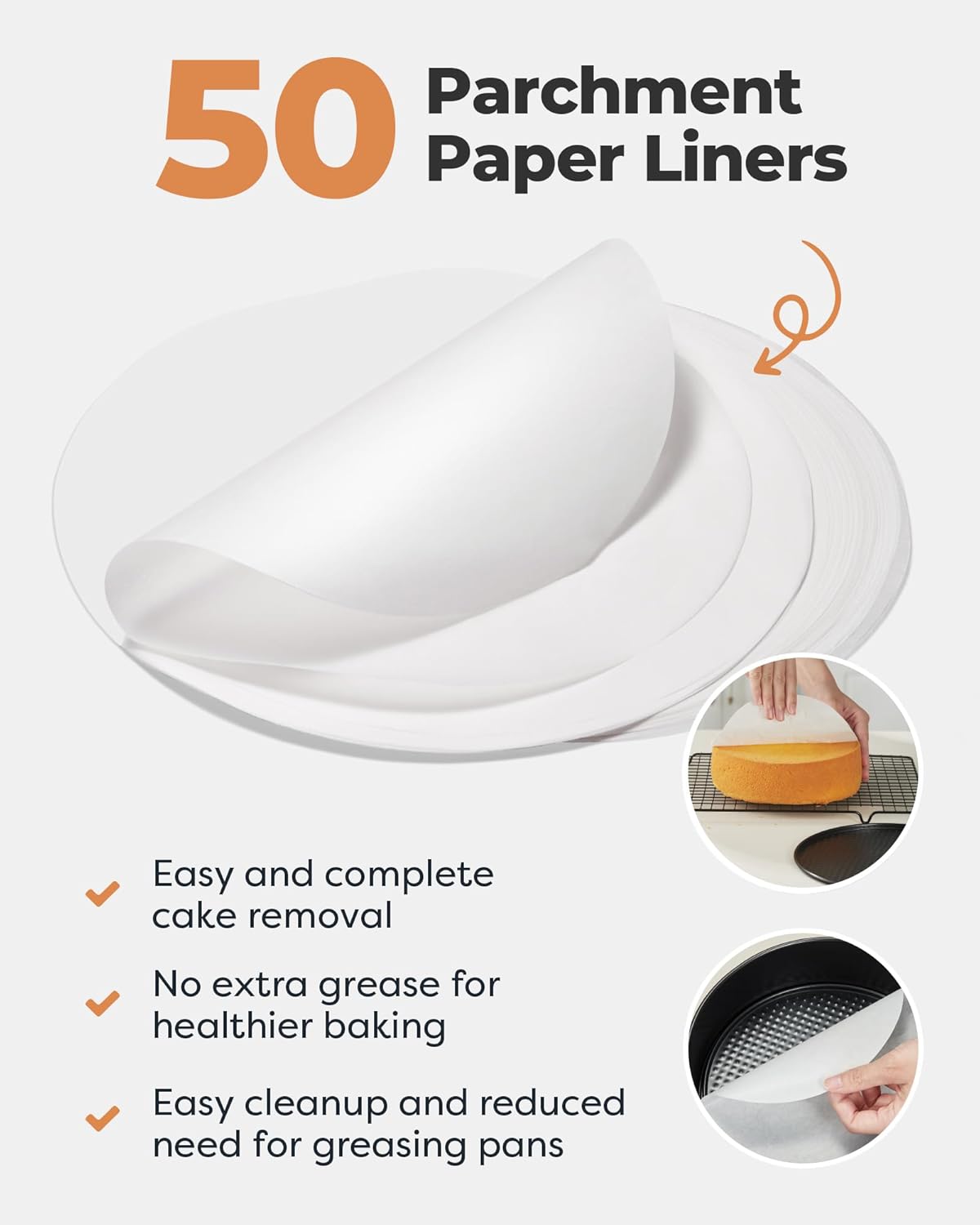 - Non-Stick Coating: The surface of the cake pan has a double layer of non-stick coating, and this design makes it easier to remove the baked cake. 50pcs 9-inch baking paper included, you can combine parchment paper and the cake mold together, which also helps take the cake out effortlessly.