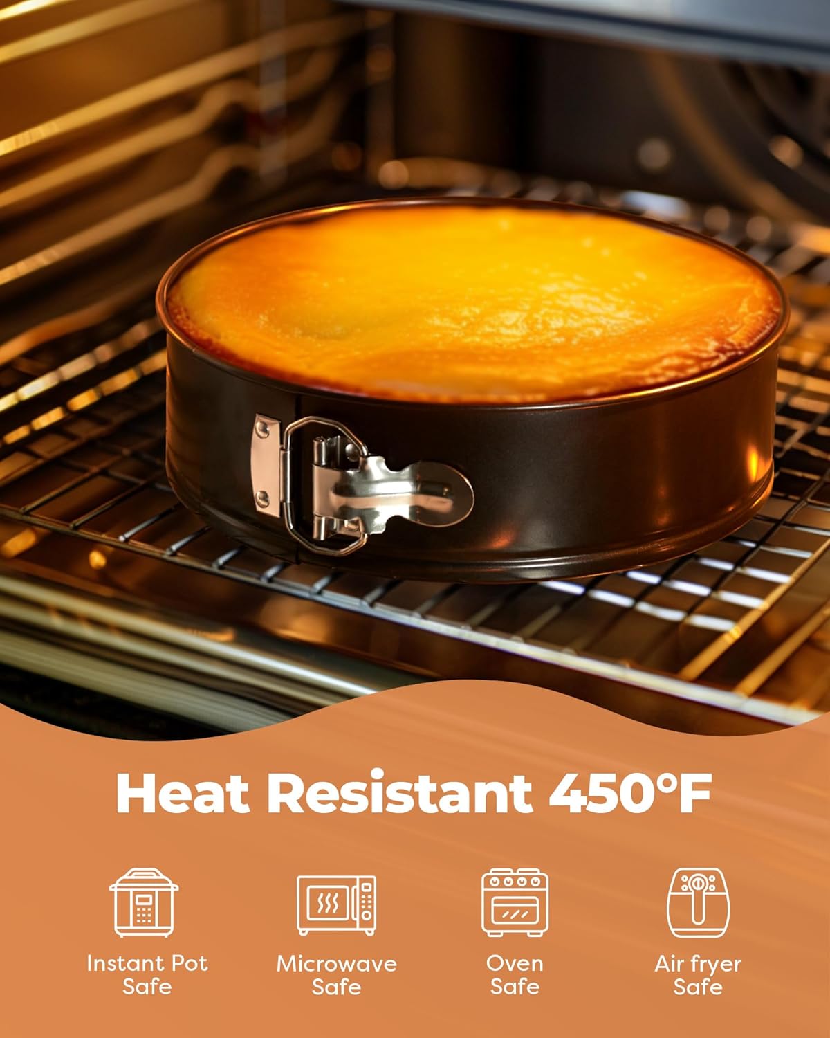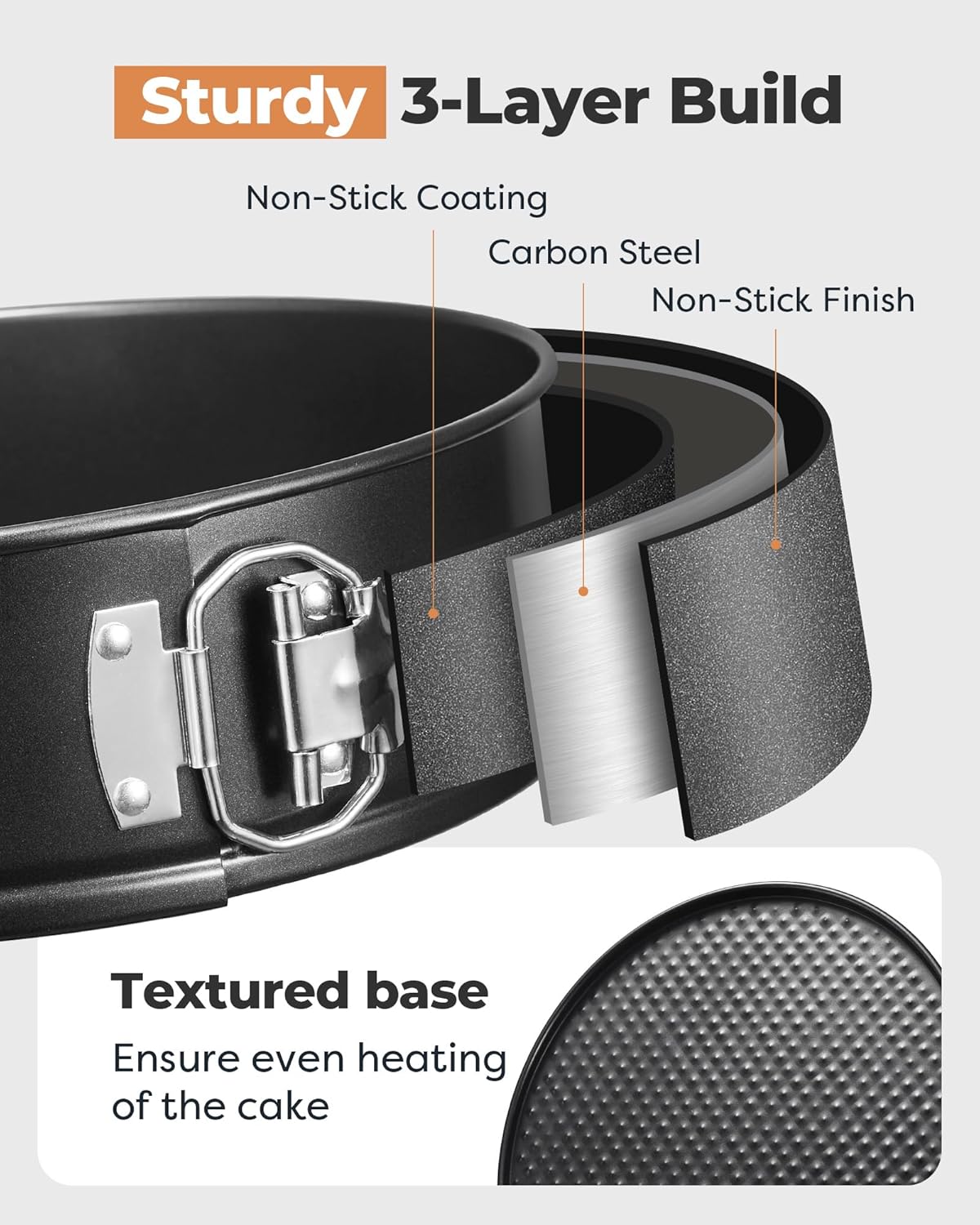 - Easy Release Baking Pans: Each springform pan consists of two parts with a detachable bottom and a 3-inch high surround. This design proves helpful when baking delicate cakes like flourless chocolate cake or cheesecake. After baking, simply release the latch on the surround and lift it upwards to easily retrieve the cake without the need to invert it, thereby maintaining the cake's integrity.