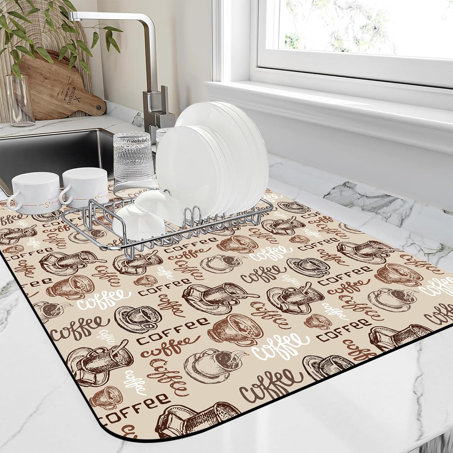 Doodle Coffee Cup Dish Drying Mat,12"X19" Absorbent Fast Dish Drying Mat for Kitchen Counter Pot and Pan, Kitchen Accessories