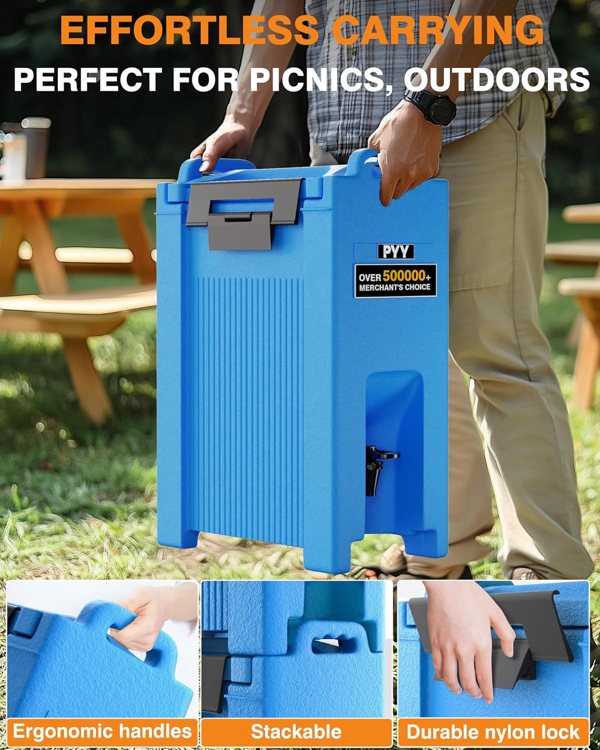 - INTELLIGENT DESIGN:The spacious nylon lock is easy to open and close with one hand. Two ergonomic handles integrated at the top of the drink dispenser make it convenient to carry. Designed with space-saving in mind, it supports stacking multiple buckets of different volumes.