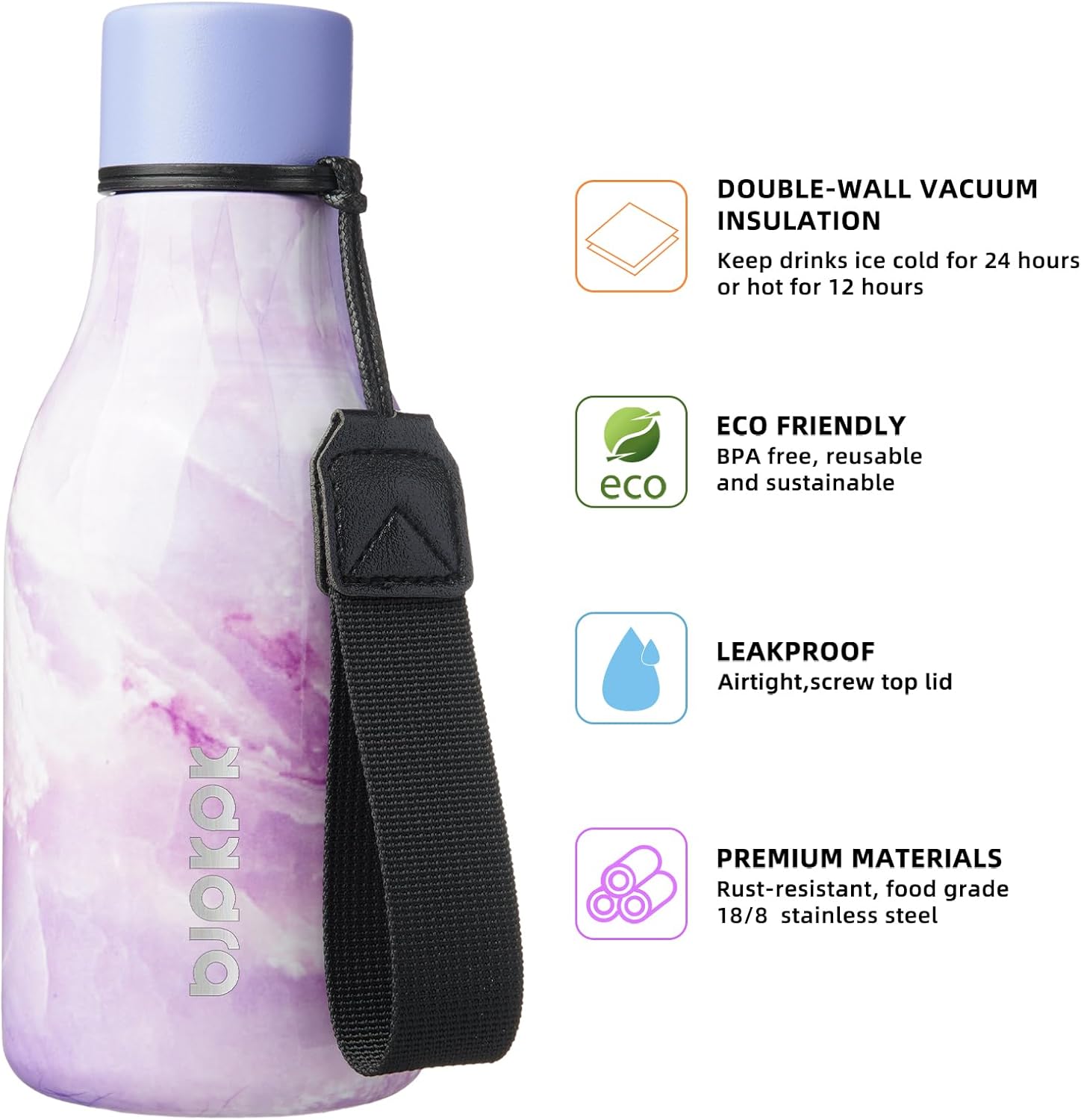 • Food-grade Materials: BJPKPK metal water bottles are made of 18/8 stainless steel with a BPA-free lid that ensures no flavor transfer, it preserves the authentic taste of your beverages. Safe for your daily water drinking. The long-lasting powder coating is non-toxic and slip-free, also gives this cute water bottles a vibrant look