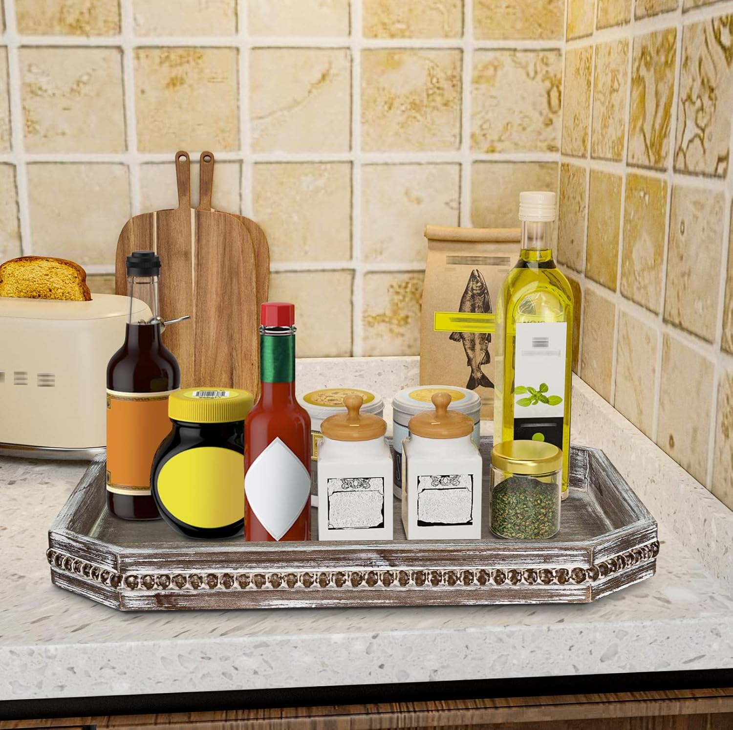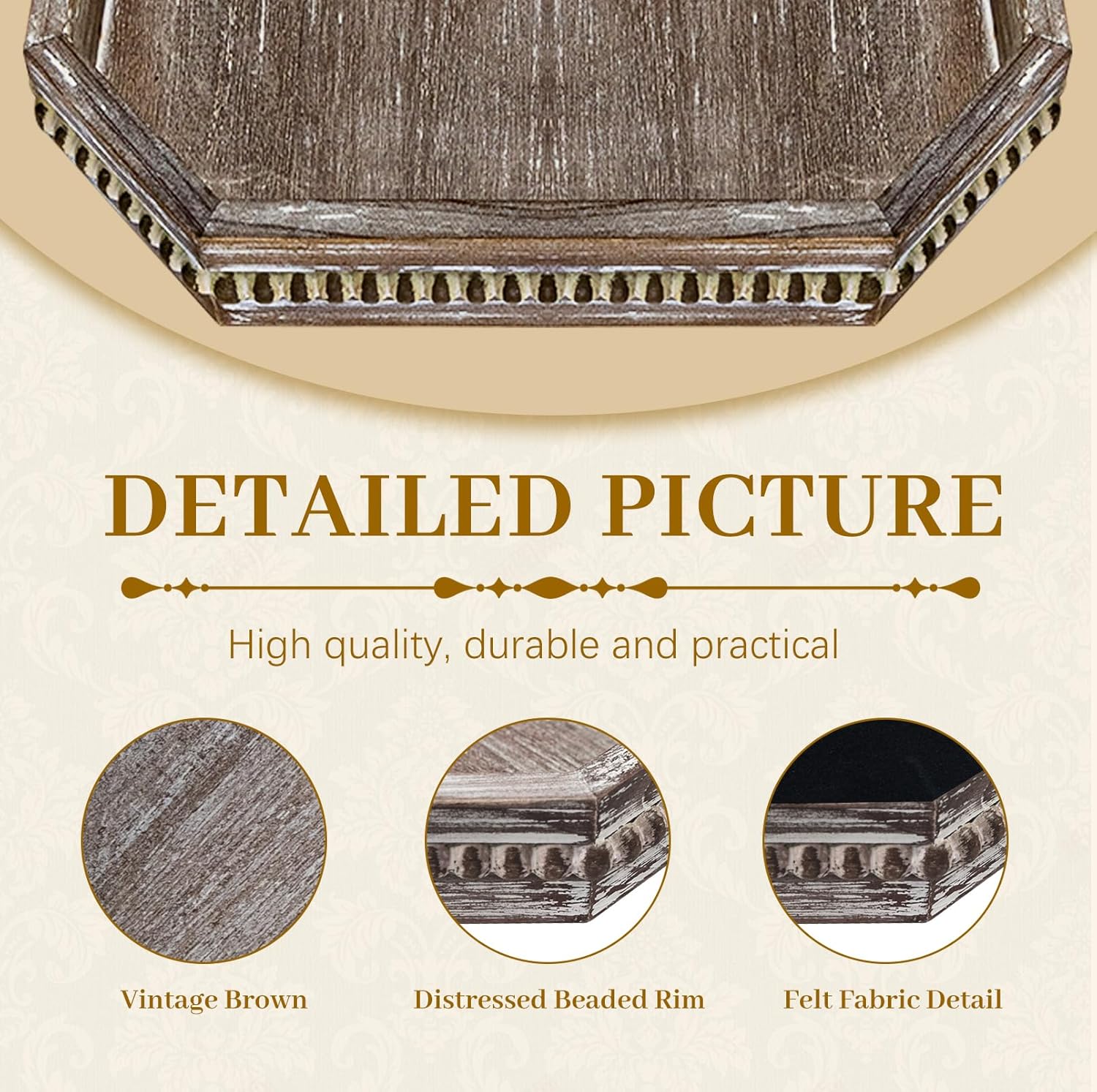 - REFINED AND ELEGANT: Octagonal serving tray is vintage brown finish and the edges are decorated with wooden beads, the distressed surface gives it a homey vintage feel. The overall appearance is unique and exquisite that goes well with many types of decor, create a fun centerpiece for your space.