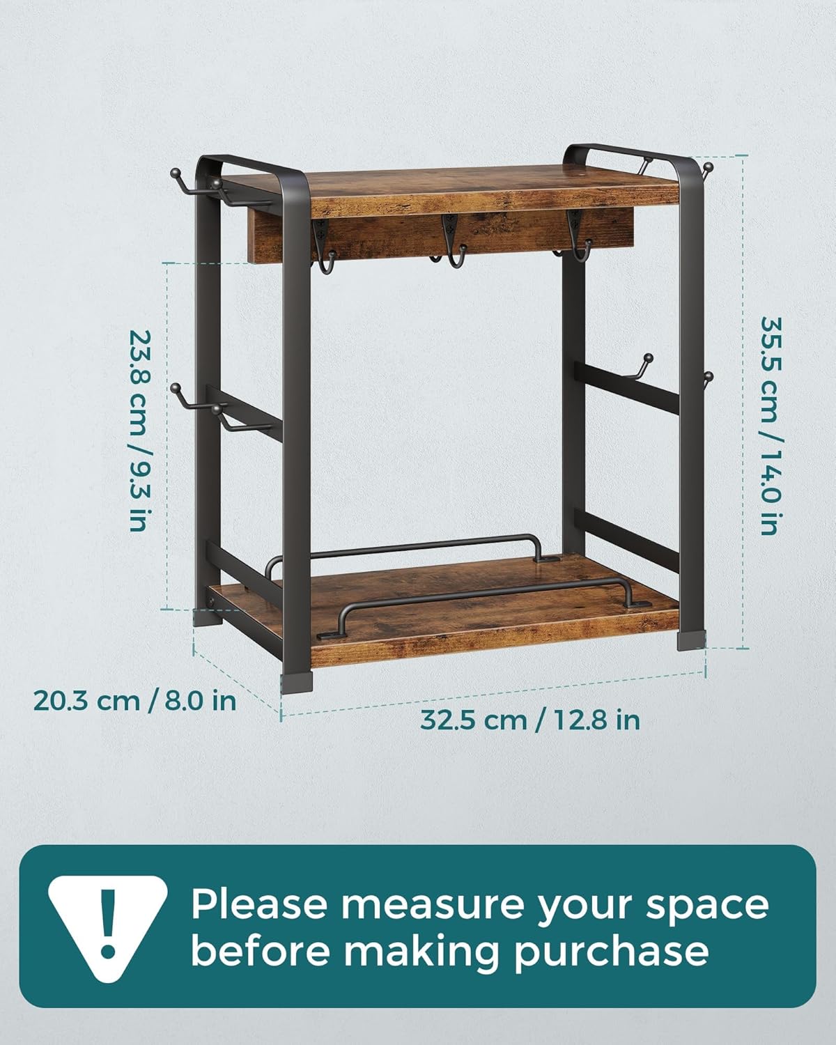 - 【Optimize Your Coffee Area Setup】Streamline your morning routine with this multi-functional coffee bar organizer, featuring a two-tier shelves and 14 sturdy hooks. Effortlessly store and access your coffee mugs, pods, syrups, and creams, all in one convenient location.