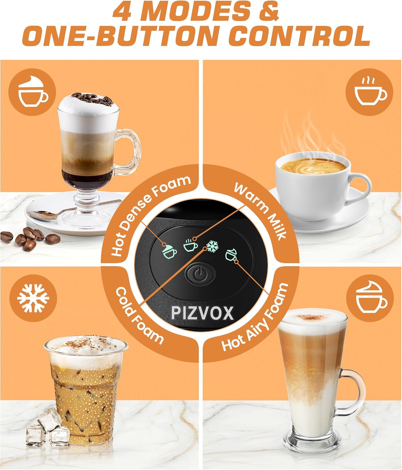- 【4-in-1 Function Milk Frother】 Easy to operate, one button to heat milk, hot cream foam, cold foam and hot chocolate milk. It is recommended to use milk with fat content greater than 3% for better results