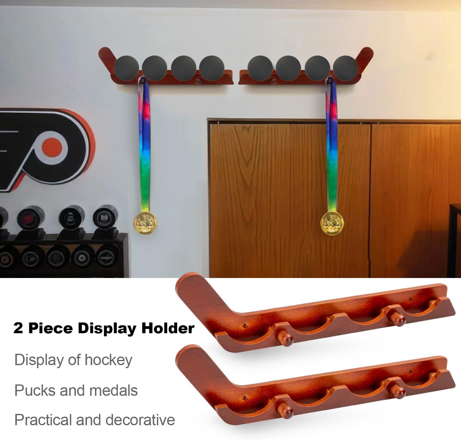 - Complete Set with Medal Hooks - Each set includes two hockey stick-shaped display cases, each capable of holding four hockey pucks. Additionally, the holder comes with two hooks designed to hang medals. It is a decorative way to honor their memorable moments.