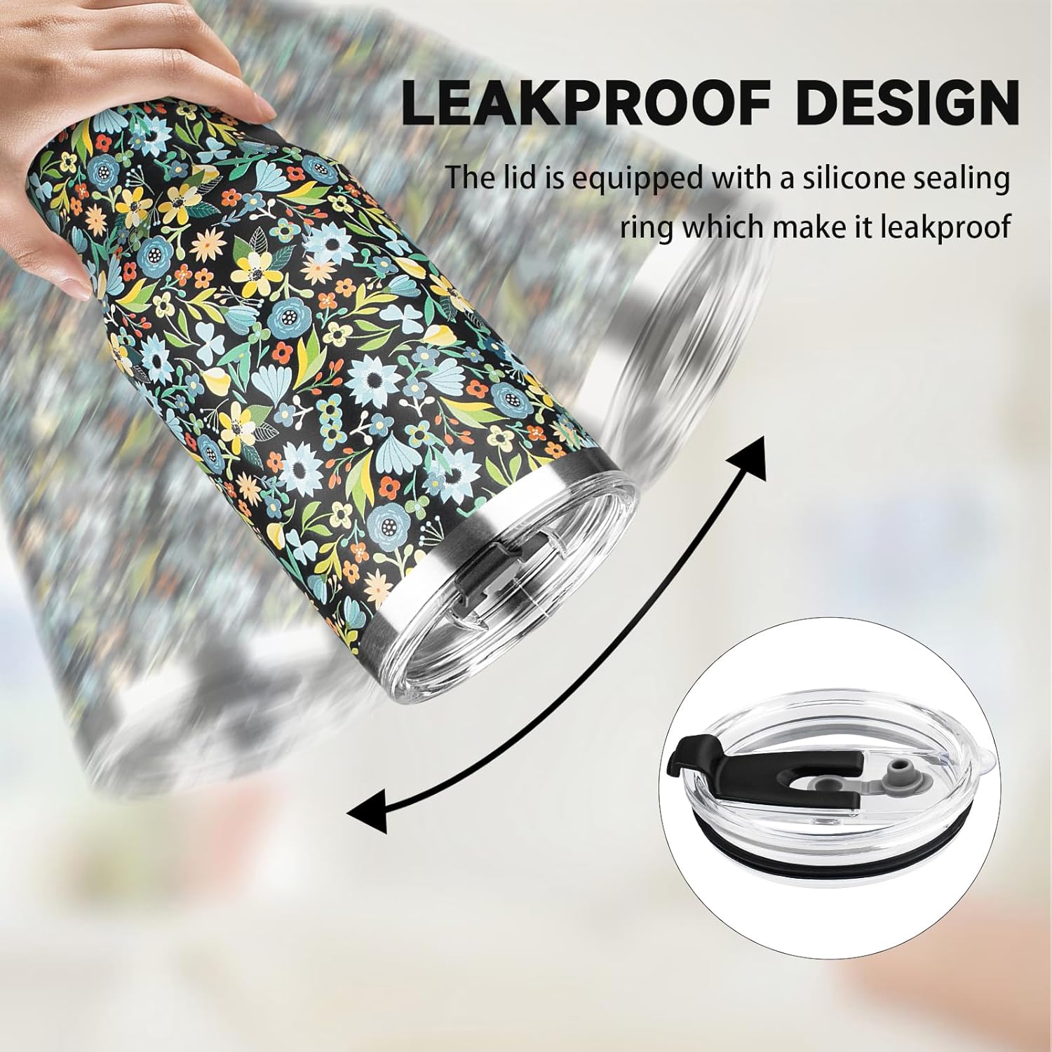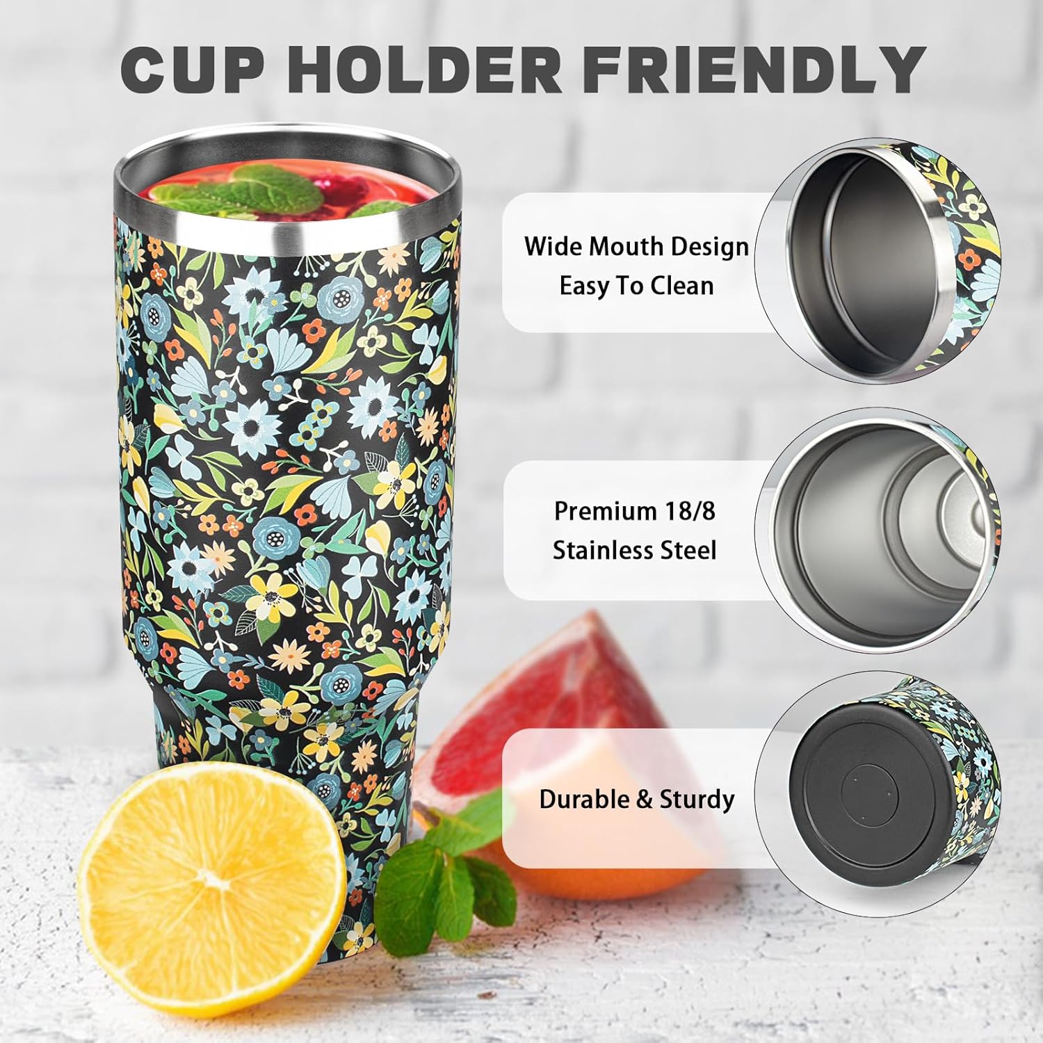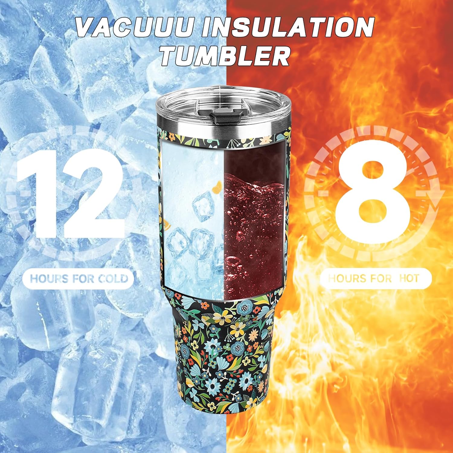 40 oz Tumbler with Lids and Straws, Stainless Steel Insulated Coffee Tumbler, Double Wall Vacuum Insulated Travel Mug Cup, Leakproof Thermal Coffee Cup for Hot and Cold Drinks (Blue Flower)