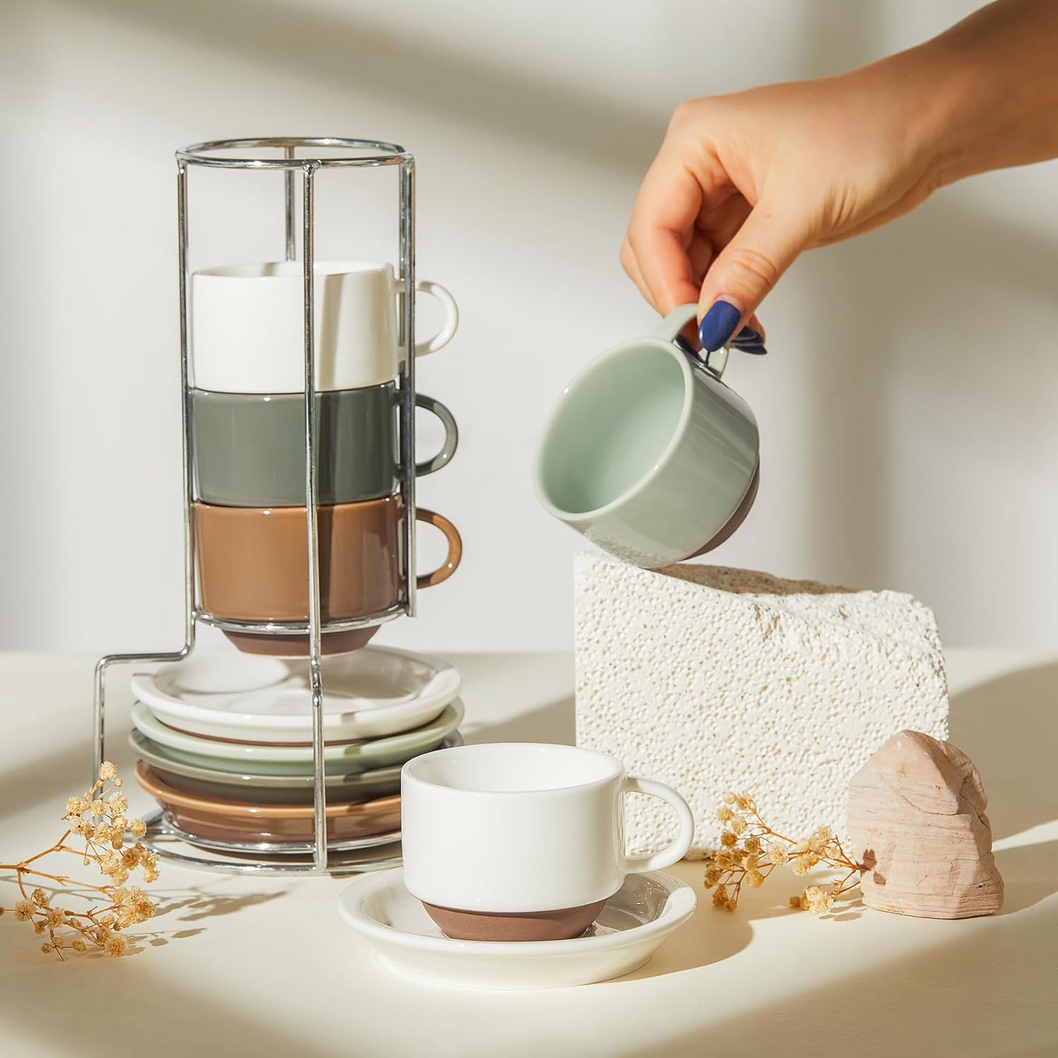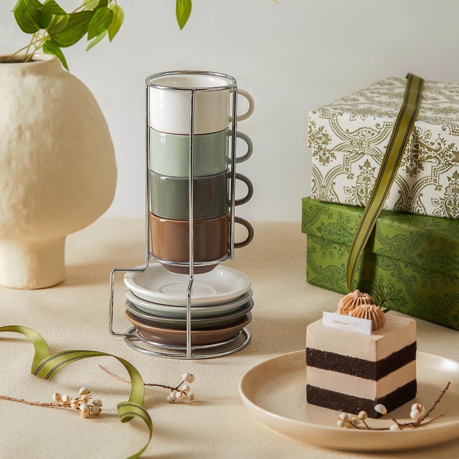 Sweese 2.5 Ounce Espresso Cups Set of 4, Porcelain Stackable Coffee Cups with Saucers and Metal Stand, Multicolor