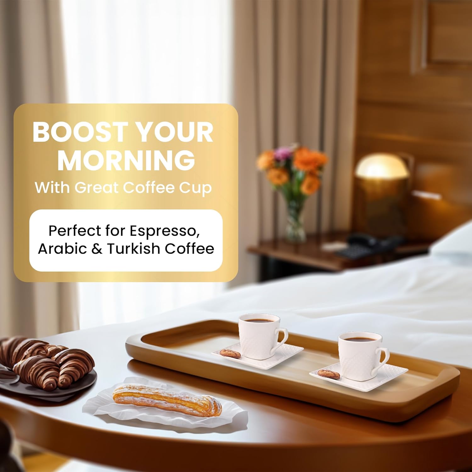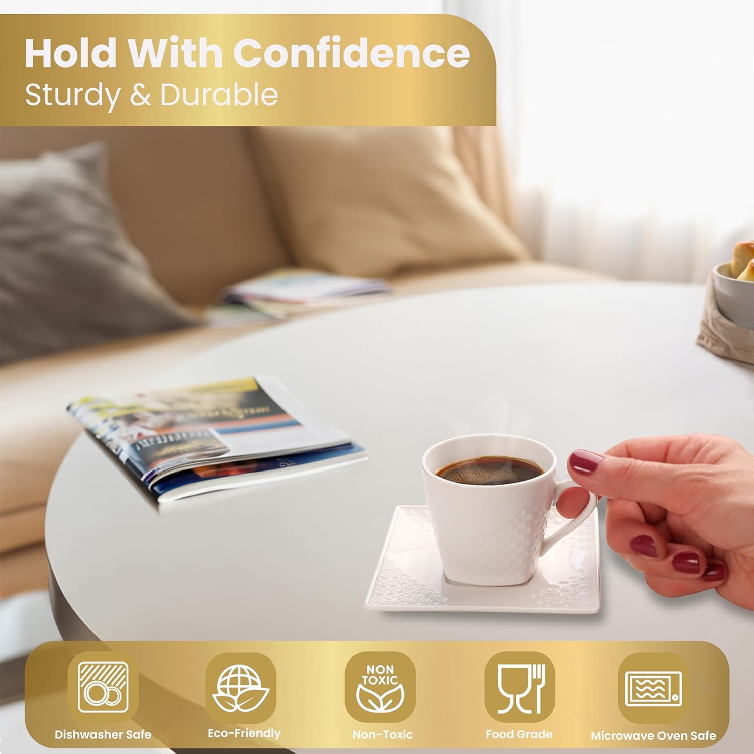 - UNIQUE STYLE & DESIGN - Espresso cups with saucer modern style & design with embossed pattern, elegant shape & appearance with their contours & handle that is comfortably easy to grip. This original turkish coffee cup set has a beautiful display, great addition & cool gifts for coffee lovers (Please review the below info for capacity, specs and the photos for visual representation)