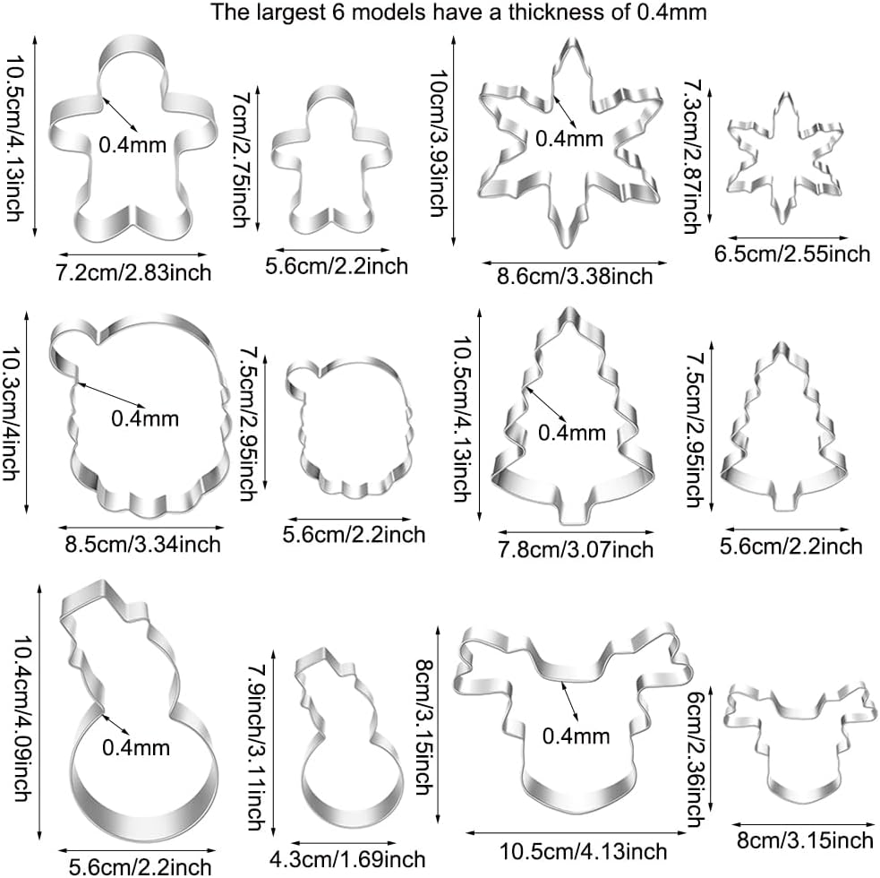 - 12 Pcs CHRISTMAS COOKIE CUTTER SET - This 12 pcs winter cookie cutters set is perfect for making a variety of holiday themed cookies and treats. Have fun decorating Gingerbread Men,Christmas Tree,Snowflake, elk,Santa Face and Snow Man for Baking Decorative Party Supplies.Please pay attention to the dimension before place the order.