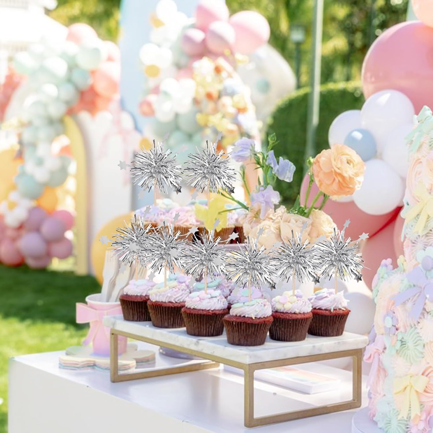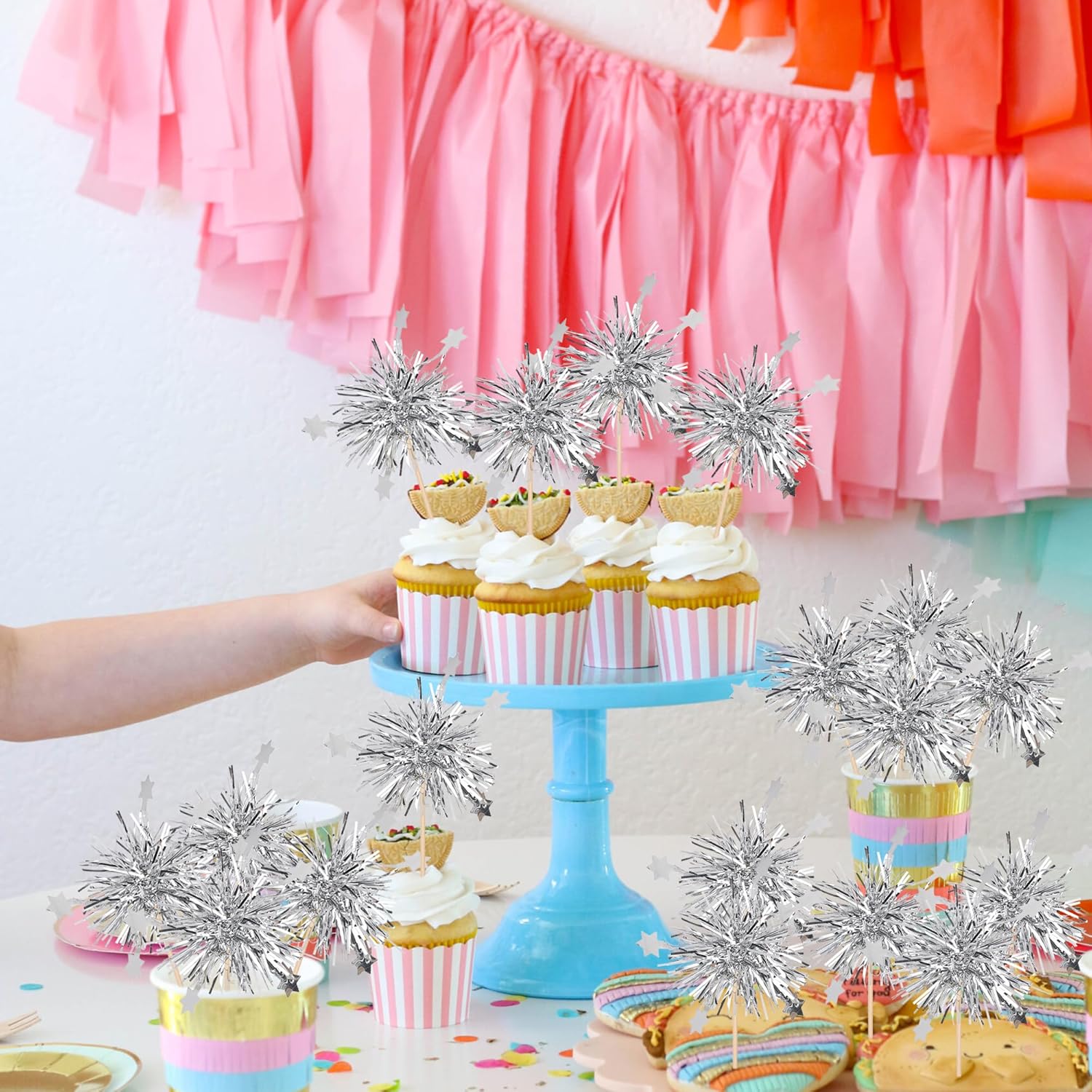 30 PCS Foil Firework Cupcake Toppers Star Cupcake Picks Sparkle Tinsel Flower Drink Stirrers Cocktail Food Fruit Toothpicks for Valentine's Day Birthday Party Cake Decorations Supplies Silver