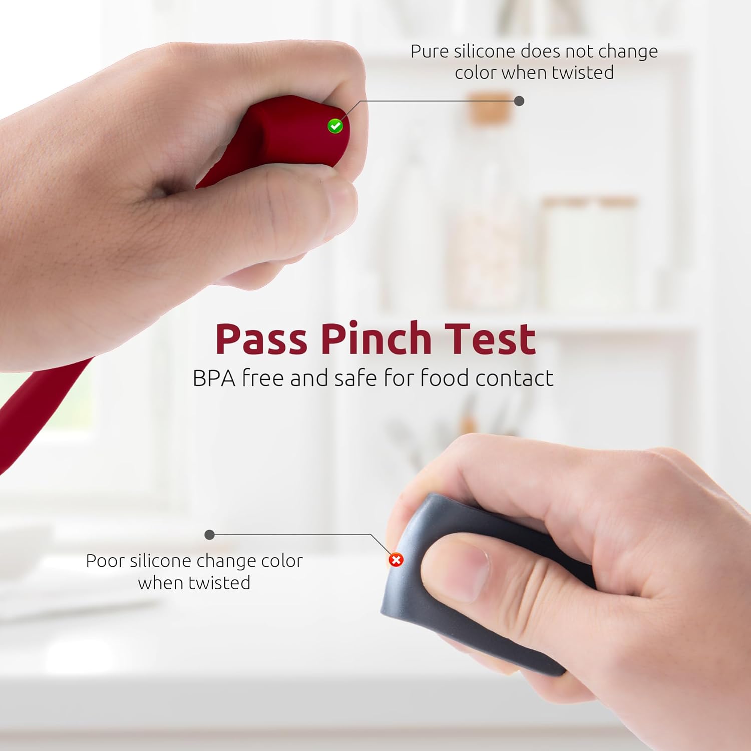 - [600℉ High Heat Resistant] U-Taste silicone jar spatula passes the pinch test, ensuring it’s completely safe for food contact. It's high heat resistant up to 600℉, making it work for handling high-heat tasks such as stirring sauces or cooking peanut brittle. This feature ensures the silicone spatula will not melt with high heat cooking and baking. The long handle also keeps your hands safe from heat. You can use it daily for your non-stick cookware as it will not damage the coating of your pan.