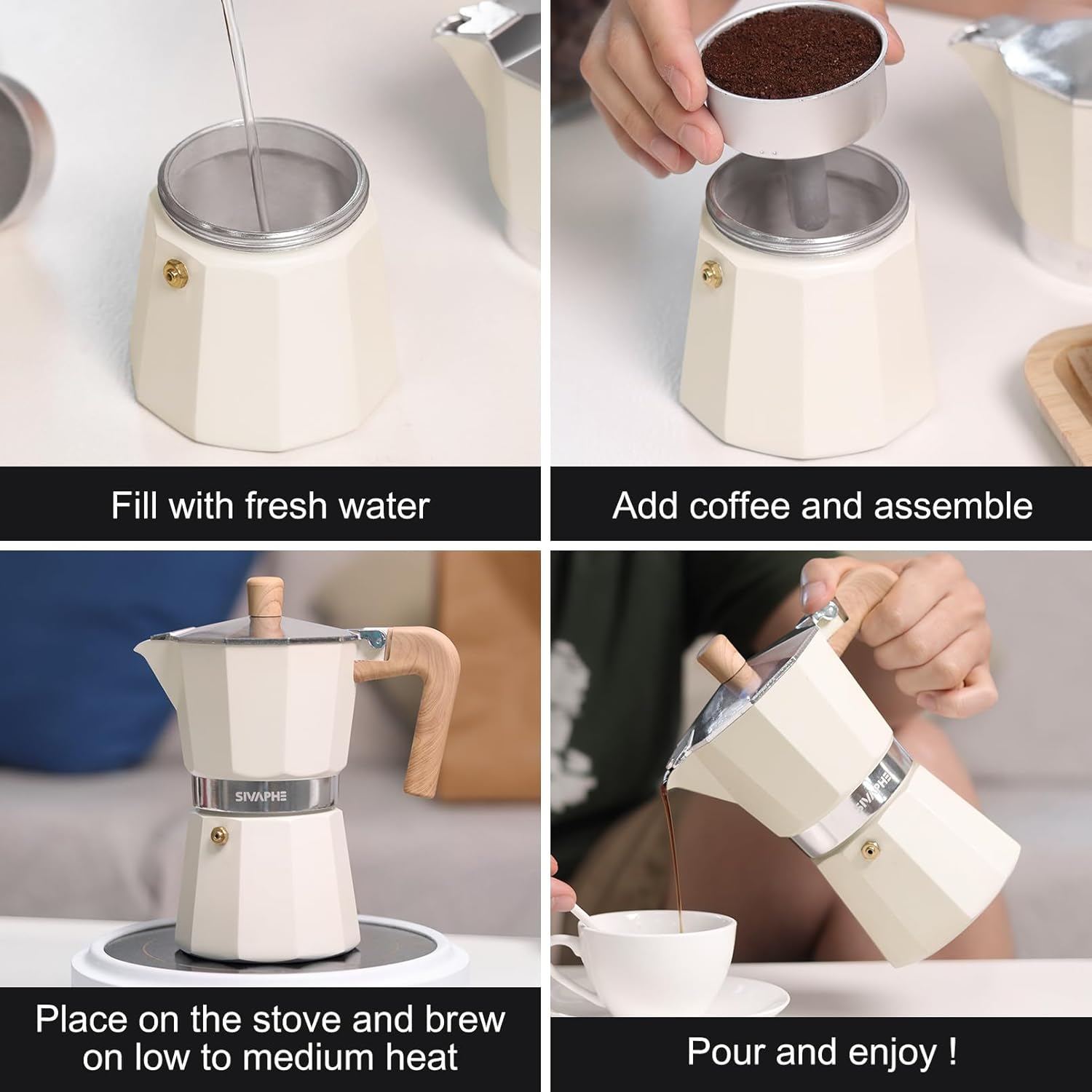 Sivaphe Aluminum Moka Pot 6 Espresso Cups, Percolator Espresso and Coffee Maker, Portable Stovetop Italian and Cuban Café Brewer for Home and Camping White
