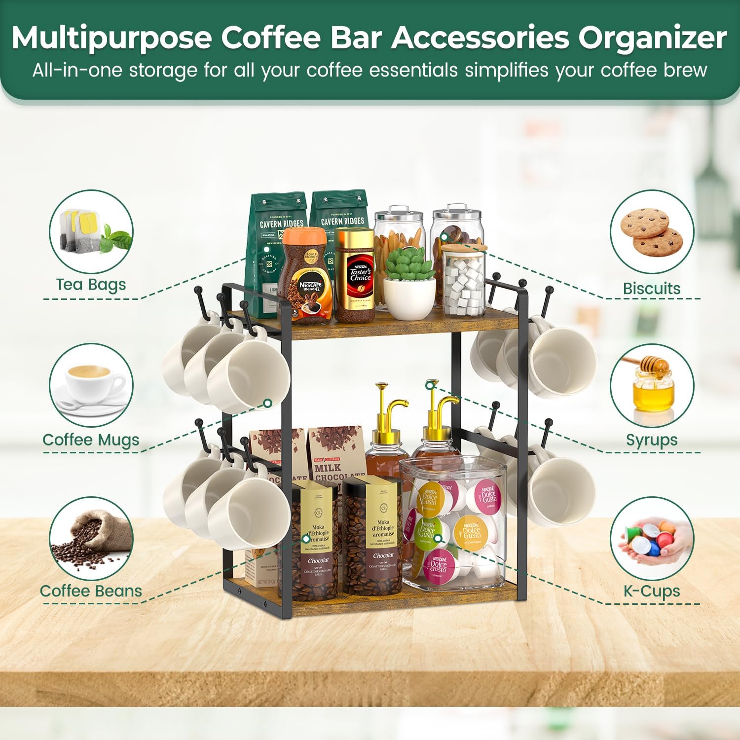 - Ample Dual-Tier Storage: Elevate your coffee experience with EsLuker.ly's 2-tier coffee mug holder for kitchen. With two shelves and 12 hooks, it offers ample space for coffee essentials, suitable for home or office countertops, meeting the storage needs of any coffee enthusiast