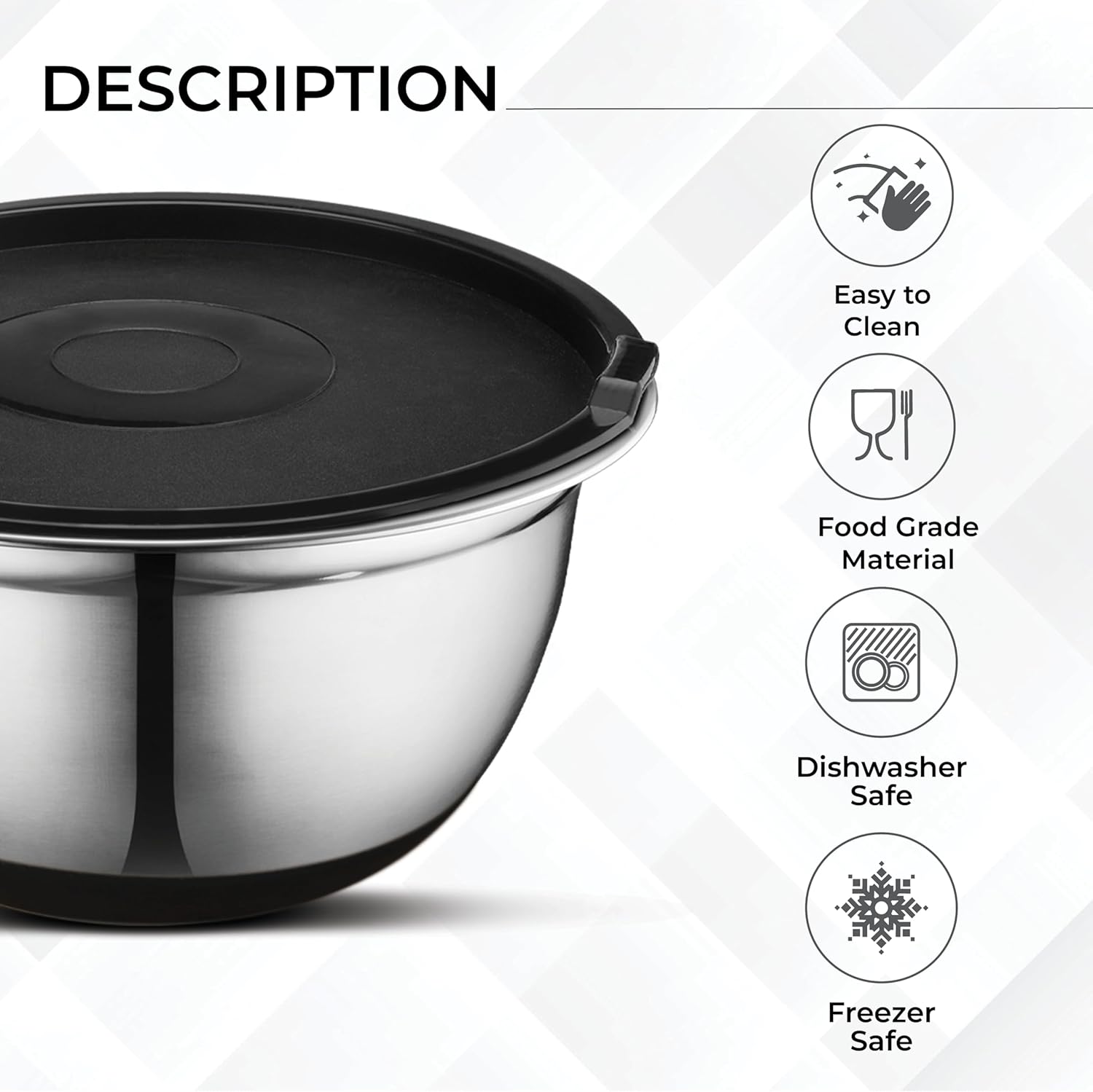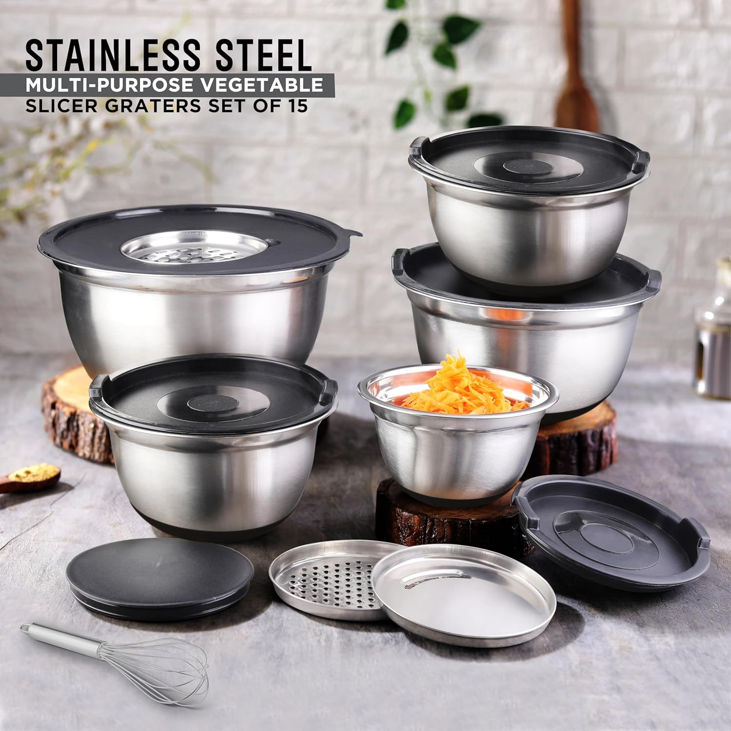 AVADOR Premium Stainless Steel Mixing Bowls Sets Brushed Stainless Steel Mixing Bowl Set, Easy To Clean, Space Saving, Great for Cooking, Baking, Prepping Needs (9 pc Anti Slip with Lid and Graters)