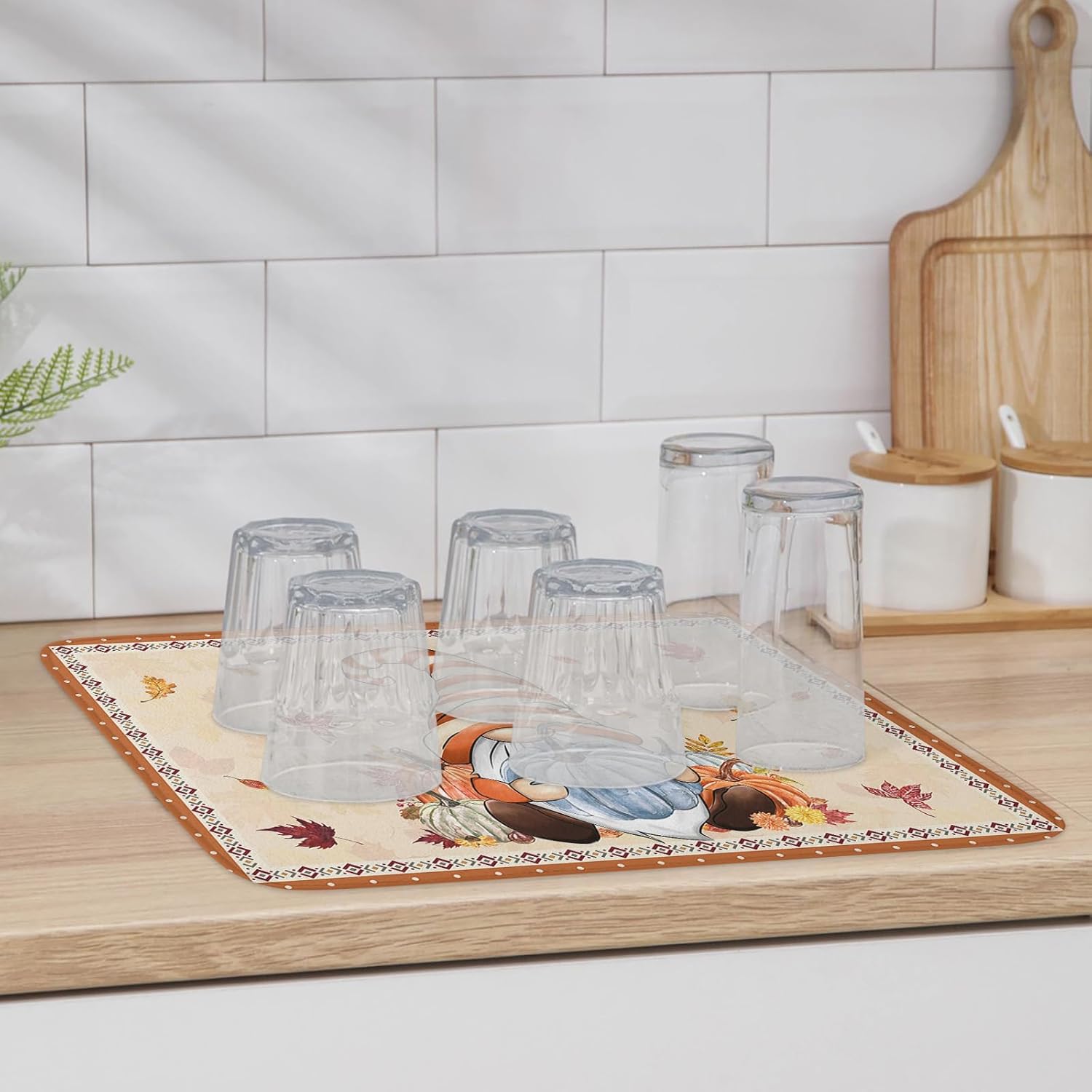 - Fall & Thanksgiving Decor - Pumpkin with gnome drying mats can add an chic holiday vibe and charm to your kitchen or coffee bar counter. The drying mat for kitchen counter with a unique hanging rope design that can be hung without occupying any space.
