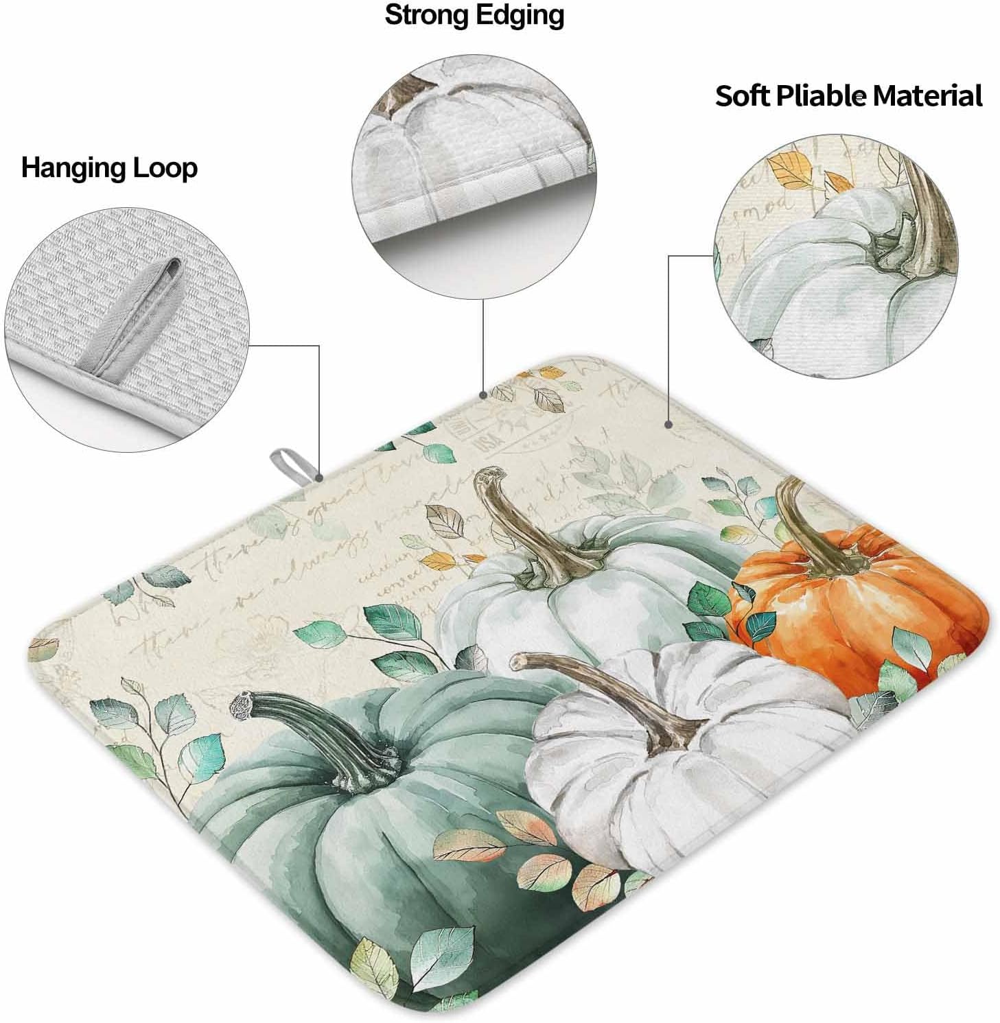 Fall Dish Drying Mat for Kitchen Counter Green Pumpkin Drying Pad Absorbent Drying Mats for Countertops Sinks Draining Racks Eucalyptus Leaves Drainer Holiday Harvest Thanksgiving Decorations 18x24