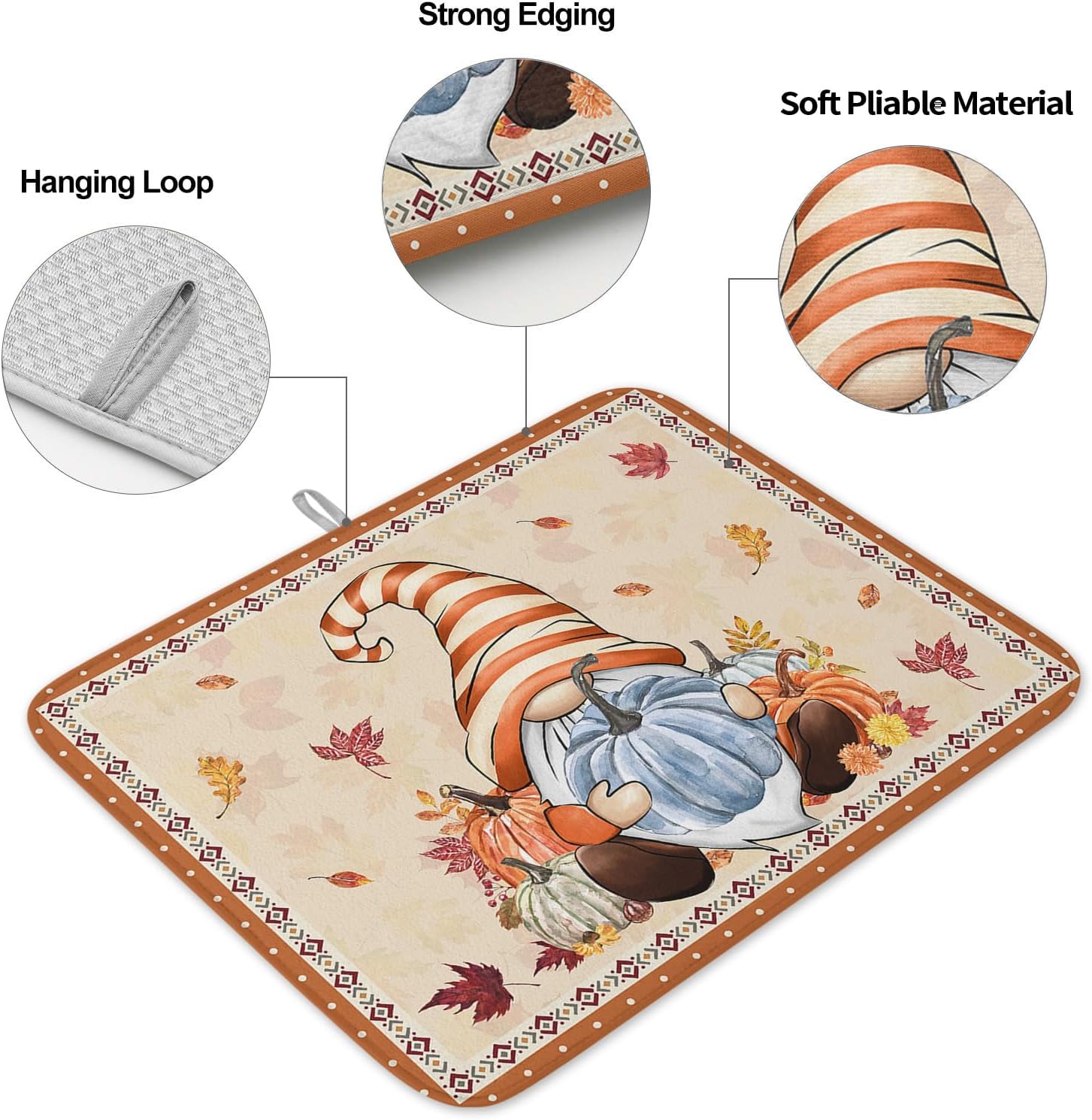 Fall Dish Drying Mat for Kitchen Counter Pumpkin Gnome Drying Pad Absorbent Drying Mats for Countertops Sinks Draining Racks Autumn Maple Leaves Drainer Holiday Harvest Thanksgiving Decorations 16x18
