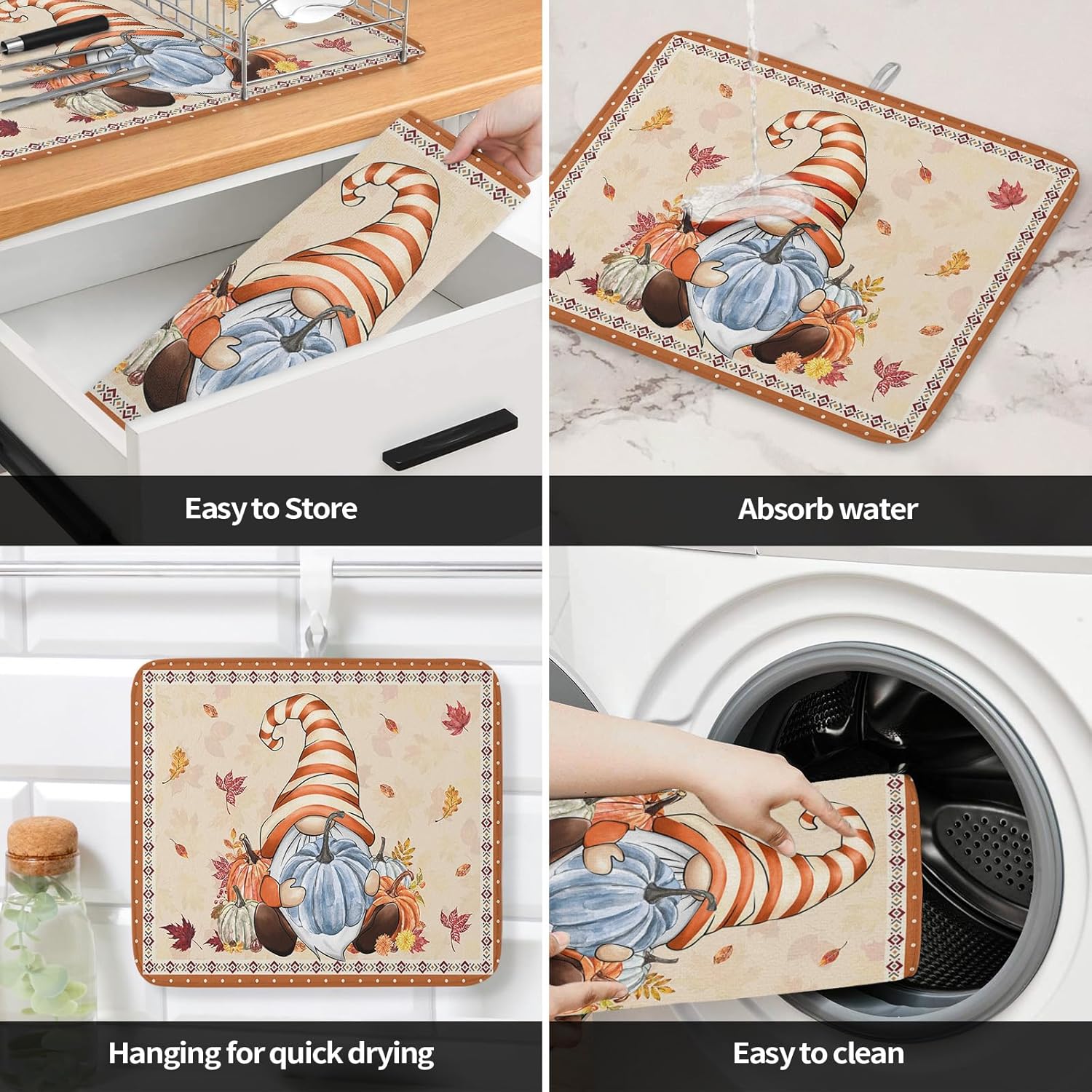 Fall Dish Drying Mat for Kitchen Counter Pumpkin Gnome Drying Pad Absorbent Drying Mats for Countertops Sinks Draining Racks Autumn Maple Leaves Drainer Holiday Harvest Thanksgiving Decorations 18x24