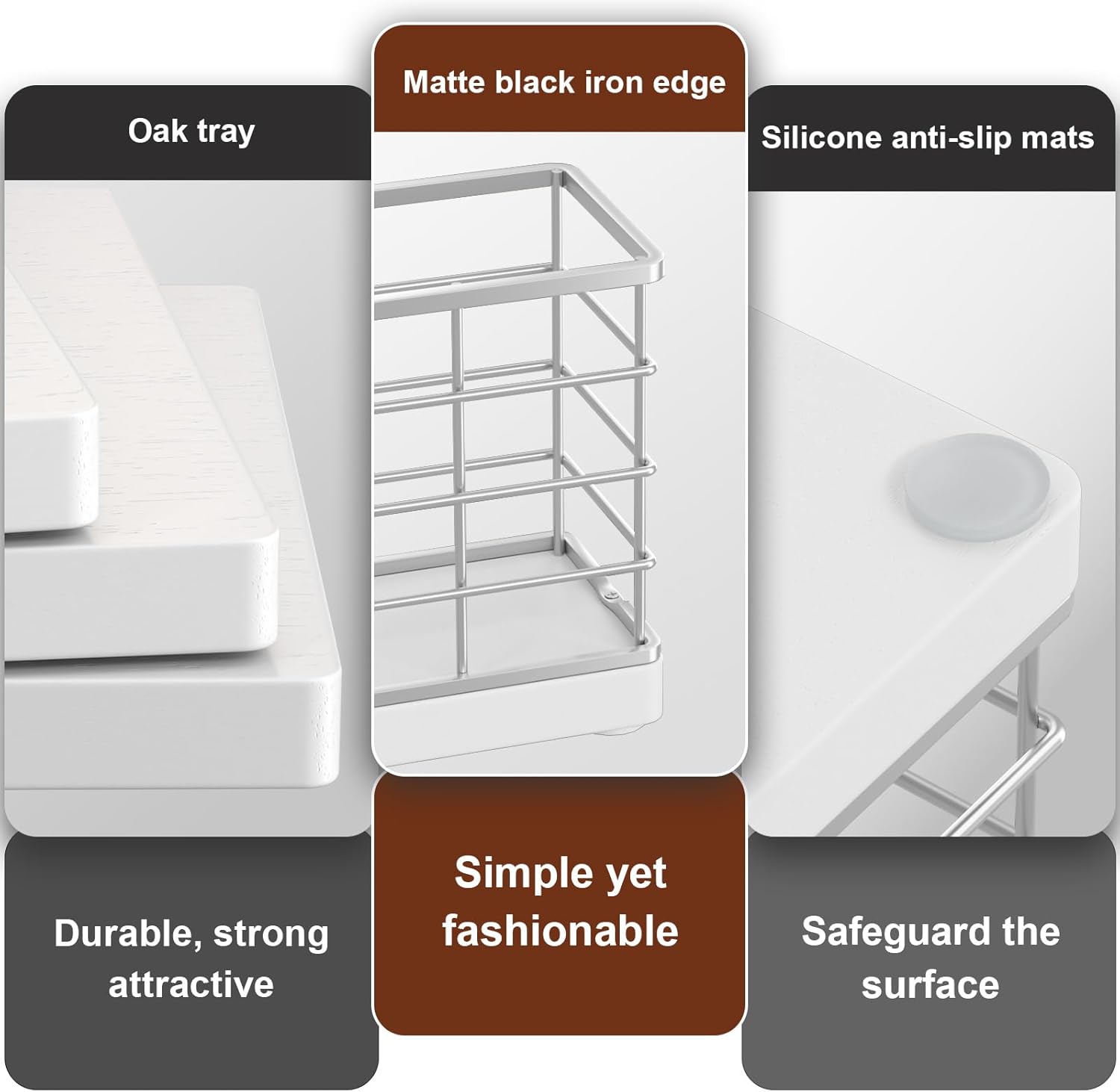- Cost-effective: No assembly required, easy to clean. The tray crafted from iron and oak is simple and attractive. The solid bottom ensures items won't fall. With silicone non-slip pads, it provides both anti-slip functionality and better protection for surfaces