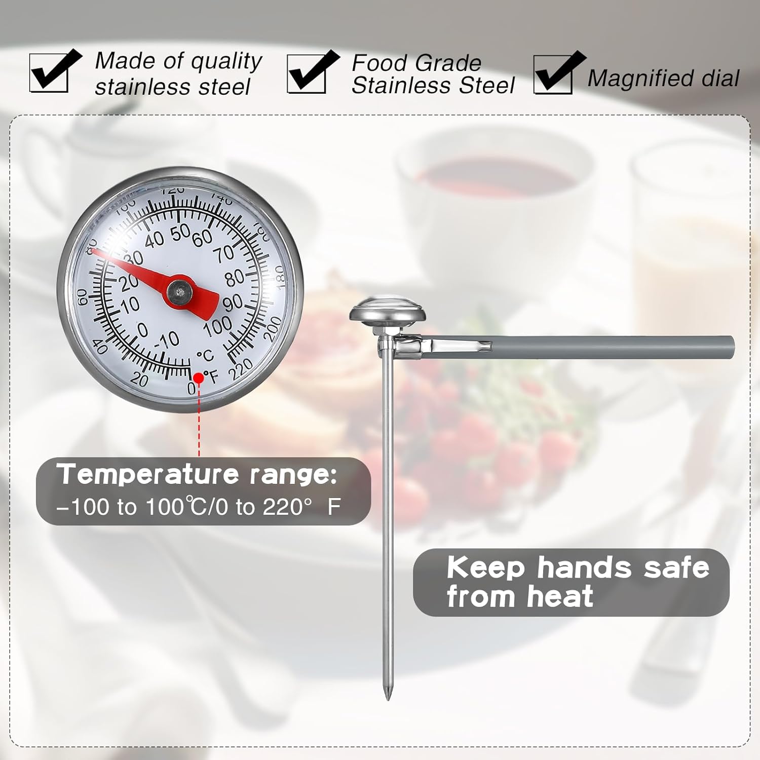 - Easy to Operate: with a fine material and a simple look, you can use our thermometer for cooking to measure the temperature of milk, coffee, beverages, red wine, tea, water, and so on, making it a useful aid in your kitchen