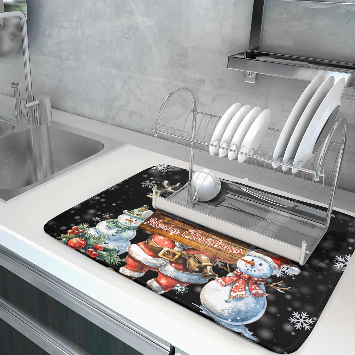 Christmas Santa Snowman Dish Drying Mats for Kitchen Counter 16"x18" Merry Christmas Santa Claus Dish Drying Mats Absorbent Microfiber Reversible Dishes Pad Dish Drainer Mat for Kitchen Accessories