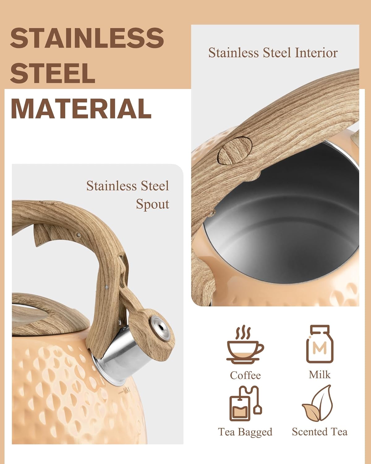 - Large Capacity & Anti-Rust Finish: This stovetop tea kettle has a capacity of 2.5 quarts, perfect for friends gathering. The main body is made of stainless steel, anti-rust and anti-corrosion, thick stainless steel makes it more resilient and strong