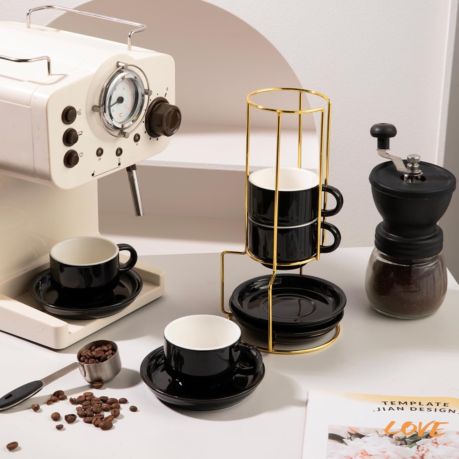 Sweejar Porcelain Espresso Cups with Saucers, 4 Ounce Stackable Cappuccino Cups with Metal Stand for Coffee Drinks, Latte, Tea - Set of 4 (Black Gold Stand)