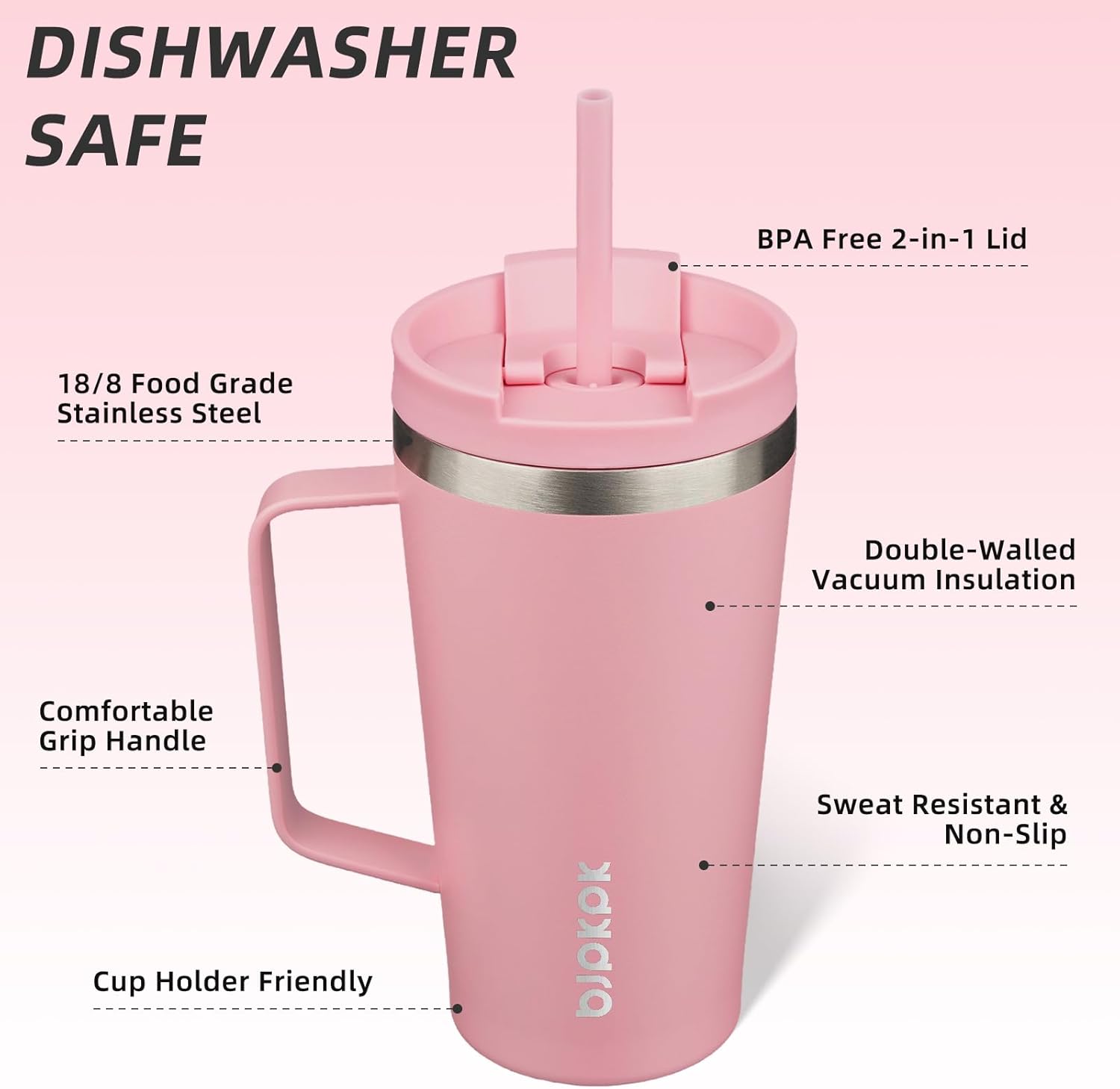 BJPKPK Insulated Tumbler with Handle, 18oz Insulated Tumblers with Lid and Straw, Stainless Steel Metal Water Bottles, Coffee Travel Mugs, Cups, Light Pink