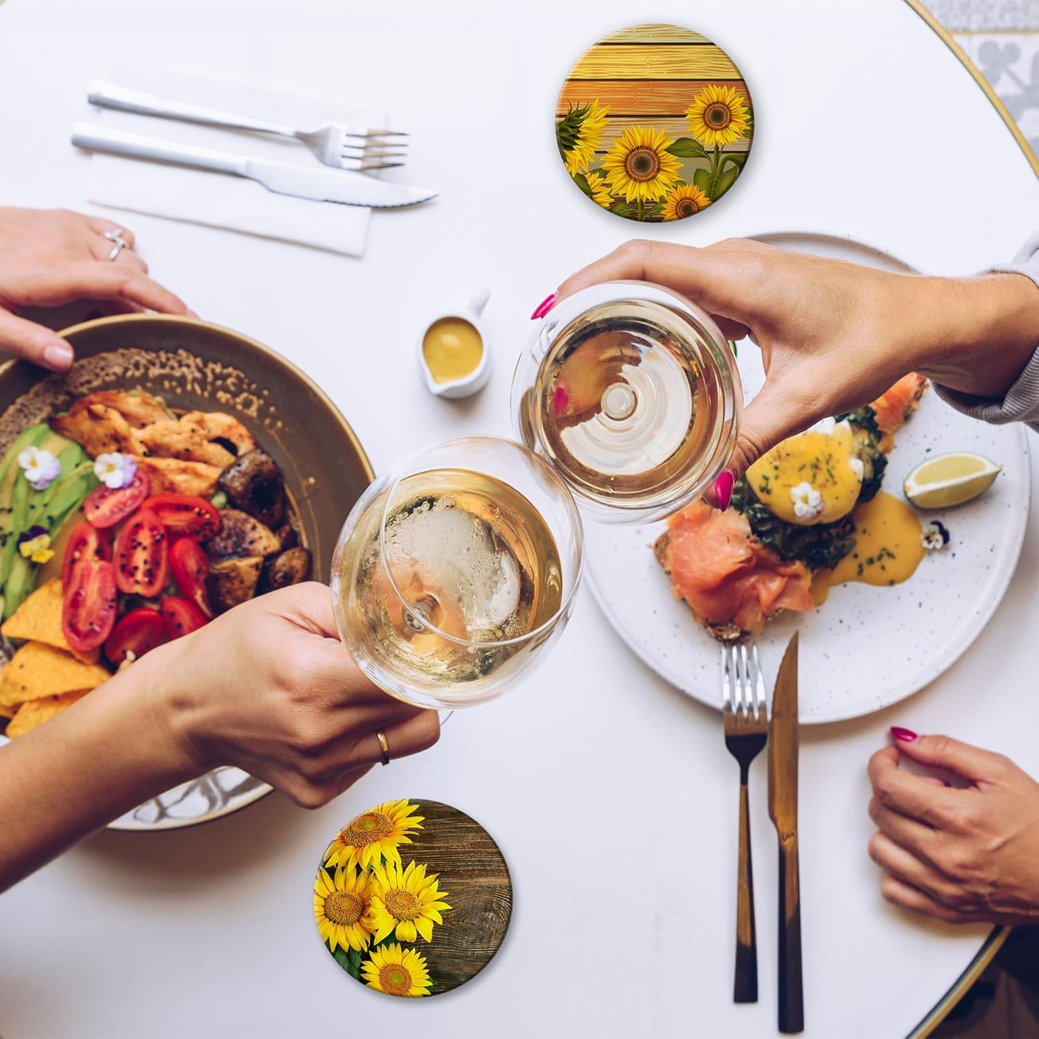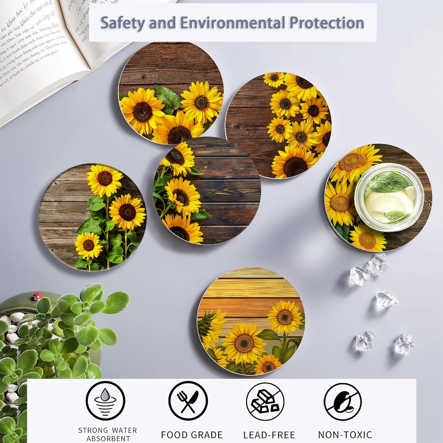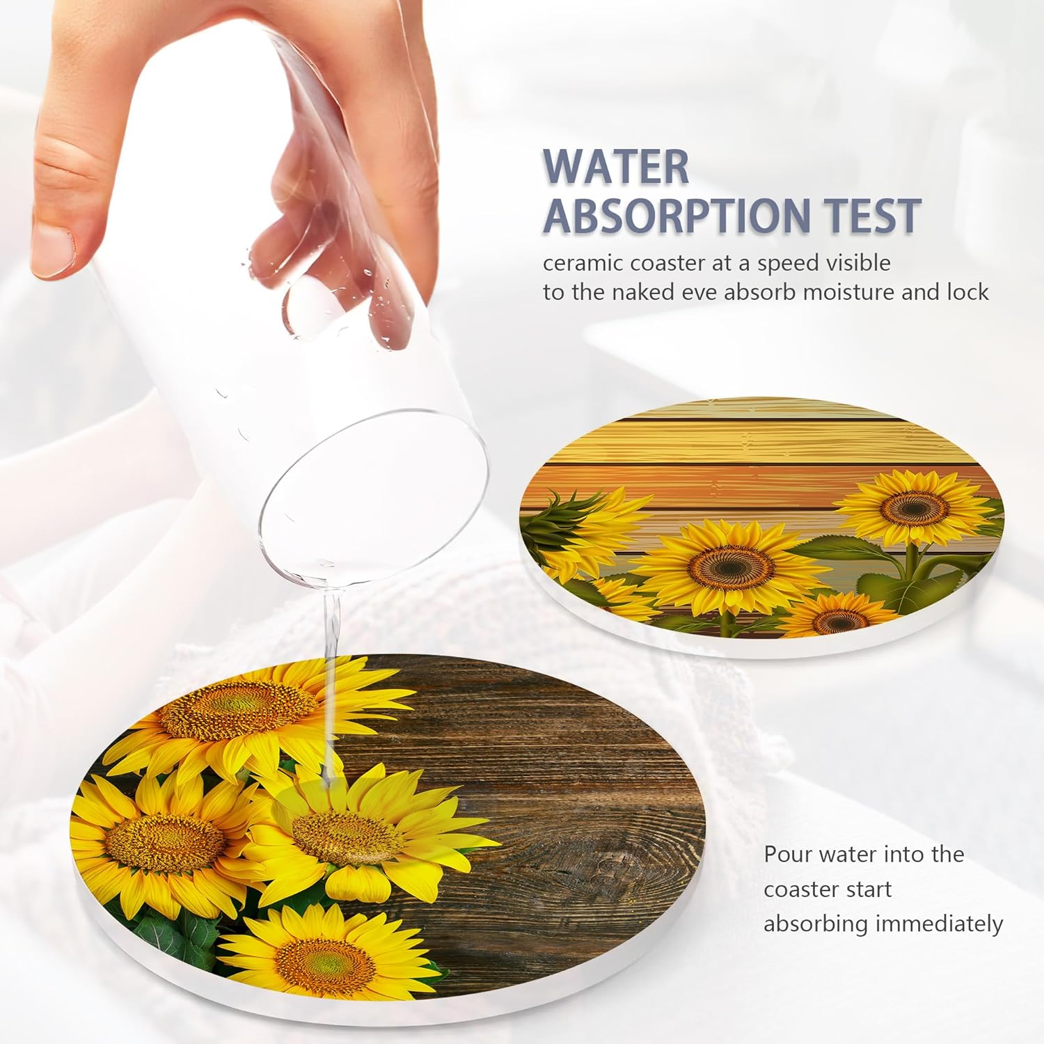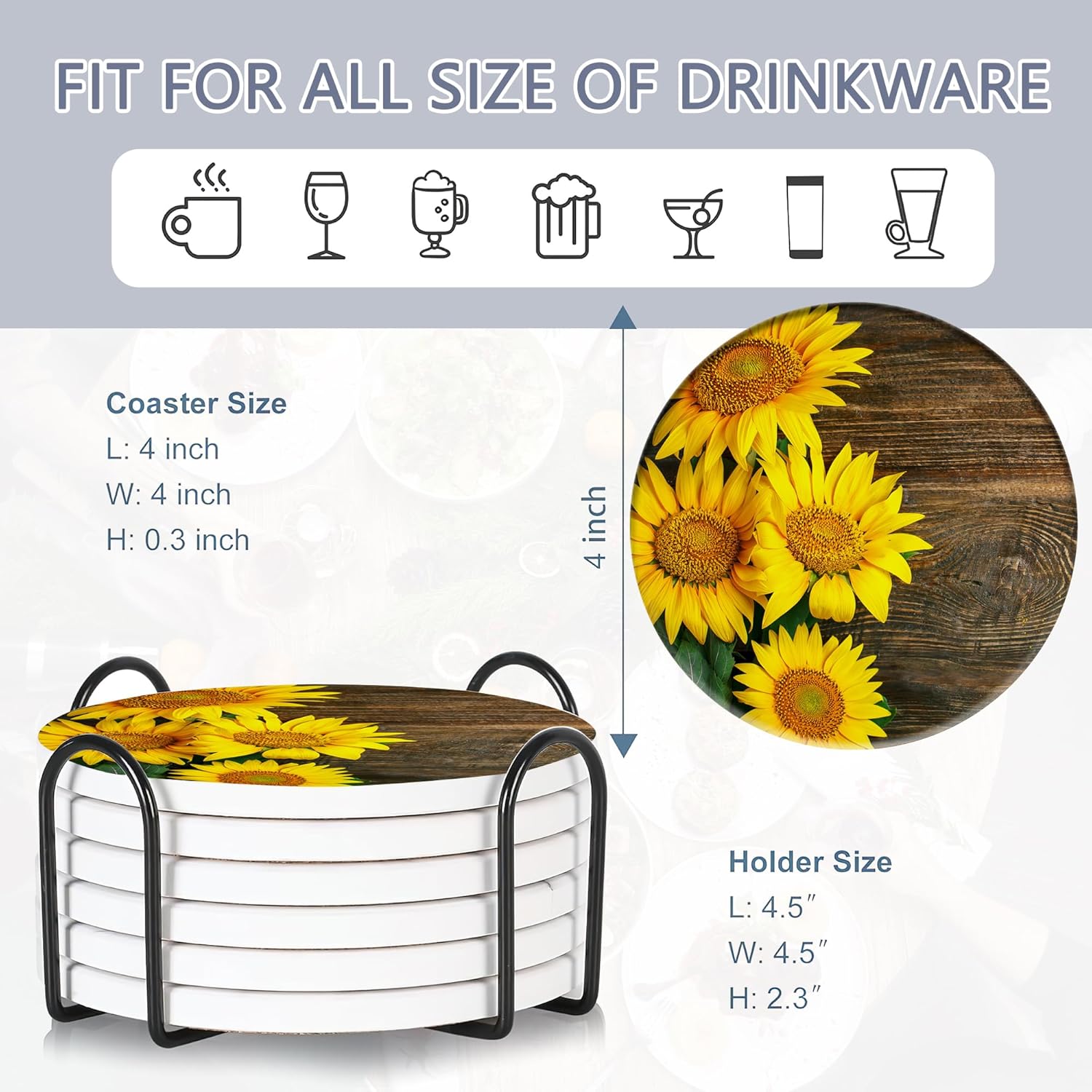 Table Coaster for Drinks Set of 6, Vintage Sunflower Wood Round Ceramic Coasters,with Cork Base and Metal Holder,Great Housewarming Birthday Gifts,Home Decor