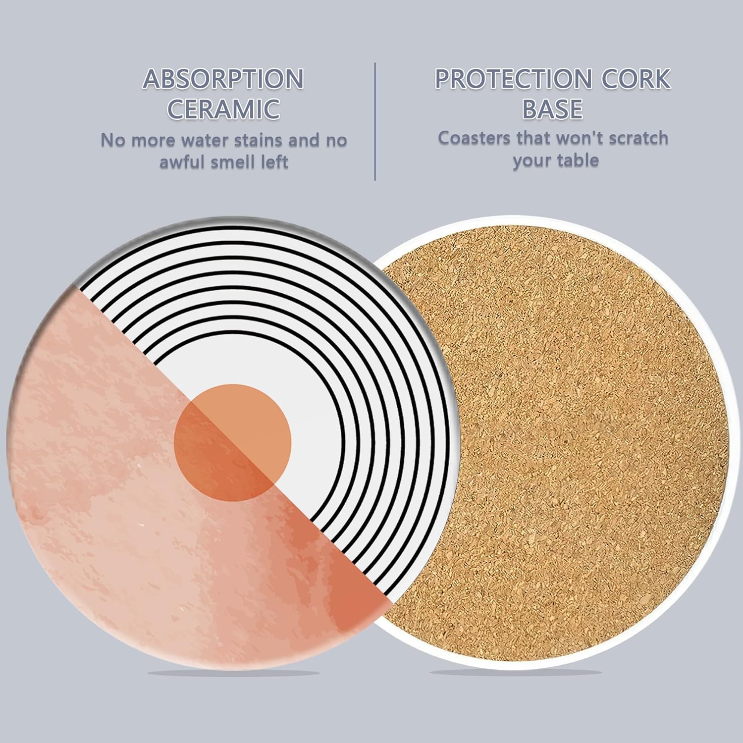 - Water-Absorbent And Cork Base: Crafted From Ceramic With a Cork Base, These Coasters Prevent Scratches And Water Stains While Providing a Non-Slip Effect For Your Drinks.