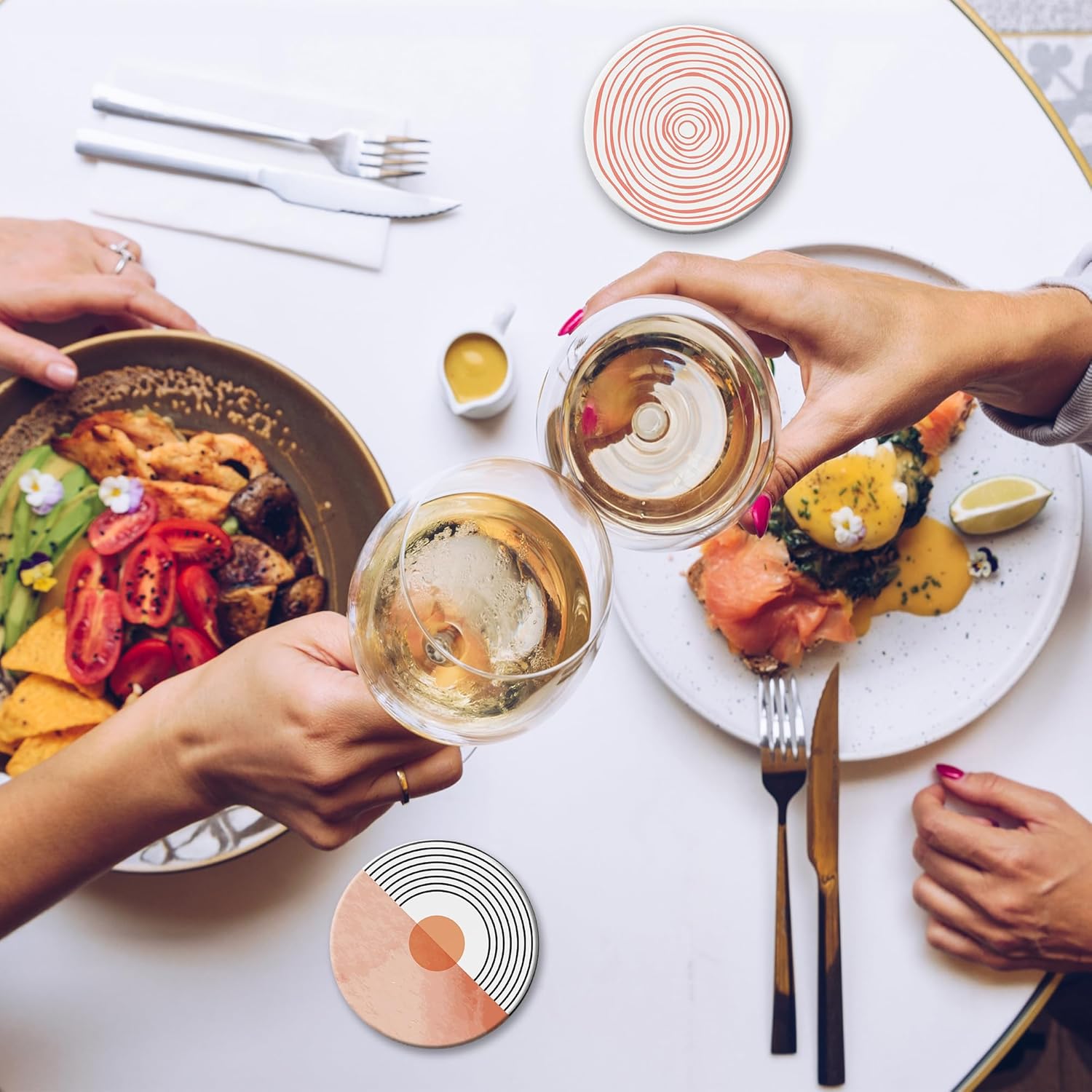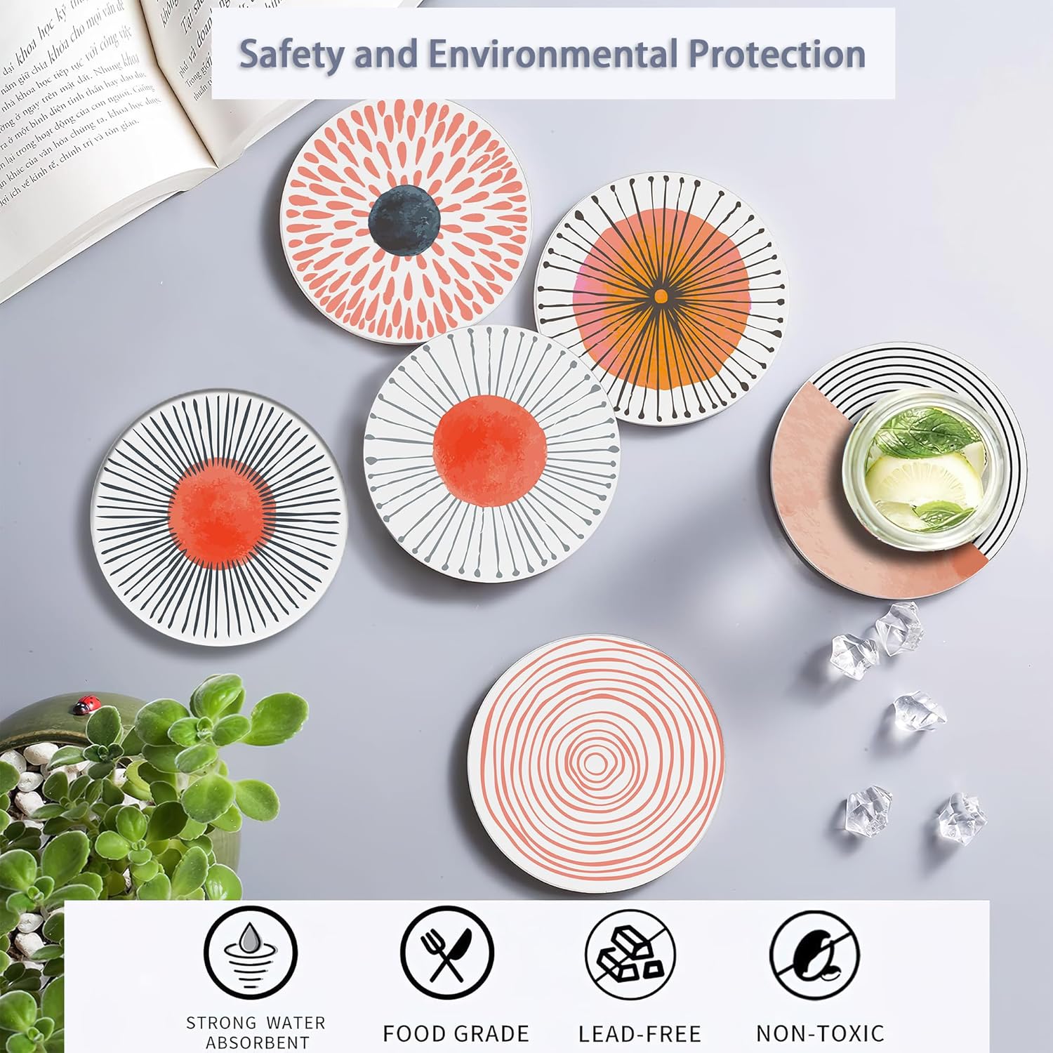 - Husiti Ceramic Coasters Set With Metal Holder: Keep Your Dining Table Stylish And Organized With This Set Of 6 4-Inch Round Coasters Featuring a Trendy Coral Watercolor Series Pattern.