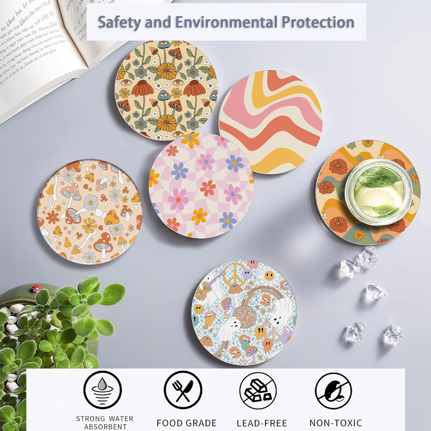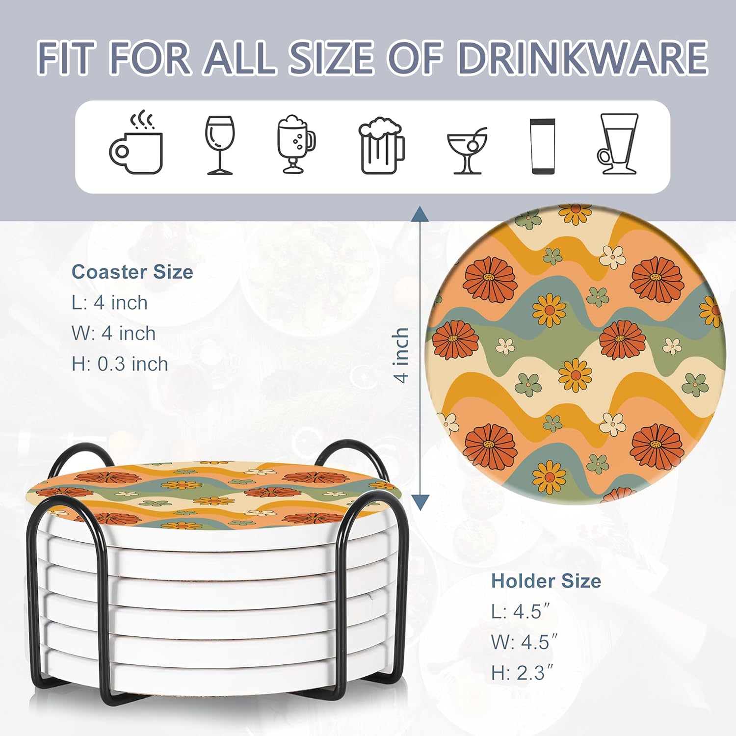 Table Coaster for Drinks Set of 6, Retro 70s Colorful Groovy Round Ceramic Coasters,with Cork Base and Metal Holder,Great Housewarming Birthday Gifts,Home Decor