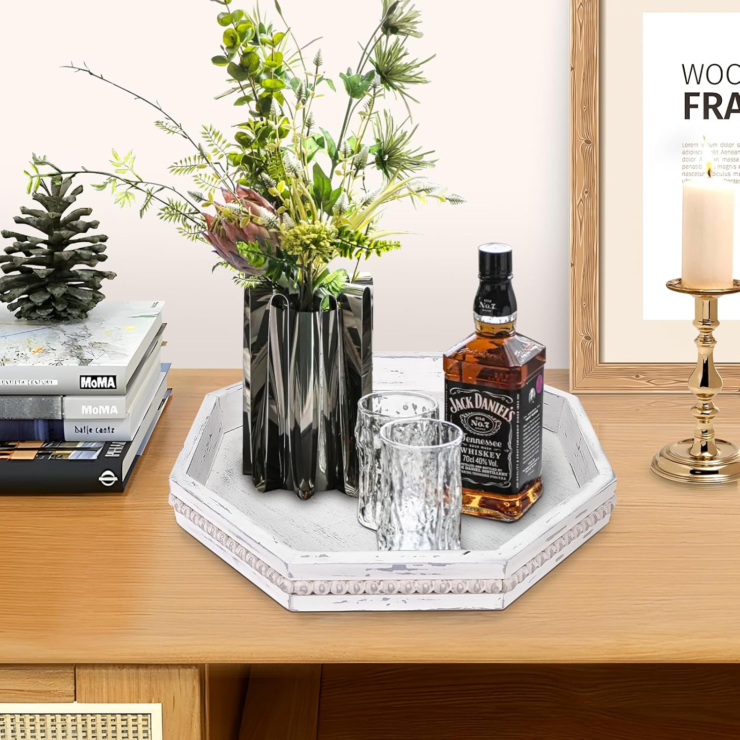 - [Vintage wooden tray]: The wooden tray has a unique design, and the tray is surrounded by resin beads, which is more textured than plastic beads. The surface is polished to retain the wood grain, and matched with retro white color, it has a natural and vintage feel. Whether it is to greet friends or relatives, this wooden tray can show your elegant taste and bring a warm and fashionable atmosphere to the home environment.