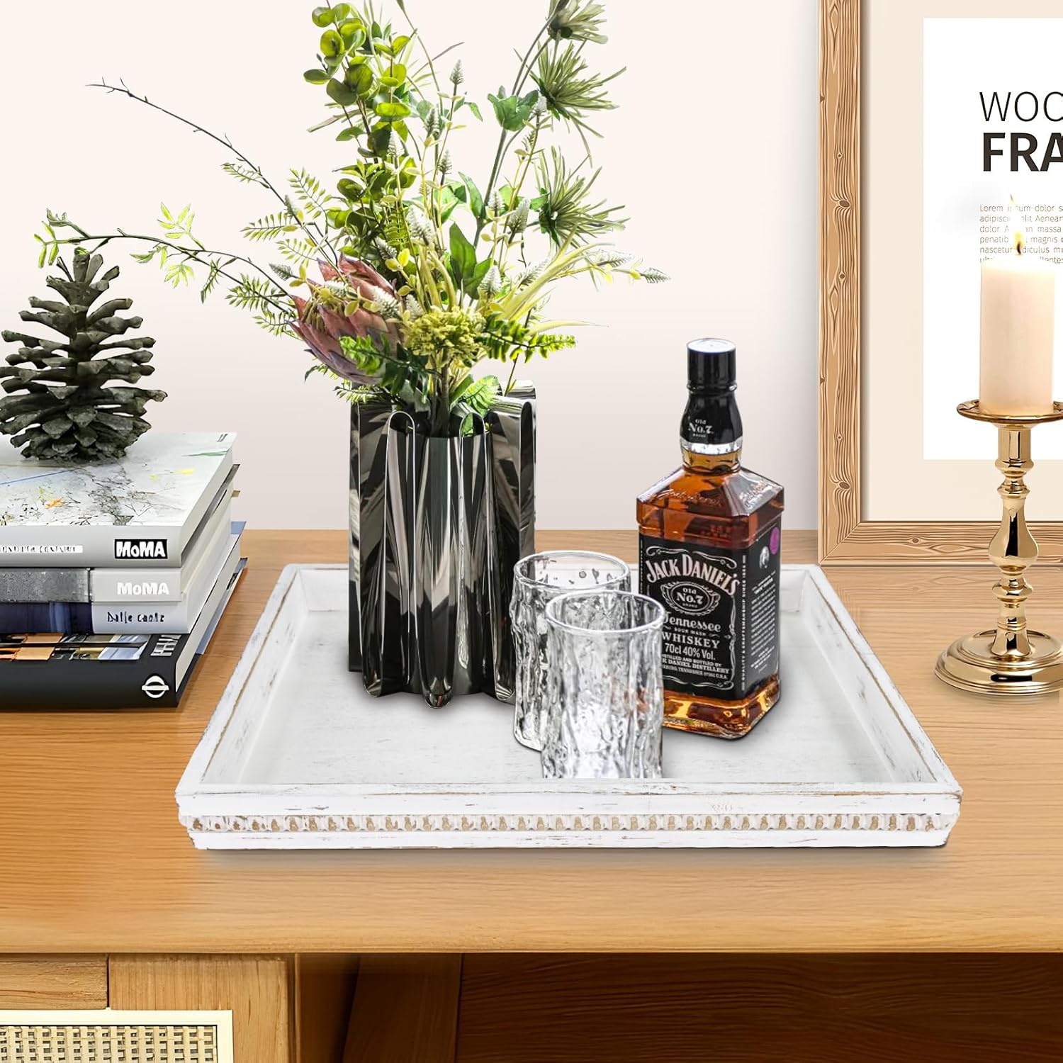 - [Vintage wooden tray]: The wooden tray has a unique design, and the tray is surrounded by resin beads, which is more textured than plastic beads. The surface is polished to retain the wood grain, and matched with retro white color, it has a natural and vintage feel. Whether it is to greet friends or relatives, this wooden tray can show your elegant taste and bring a warm and fashionable atmosphere to the home environment.