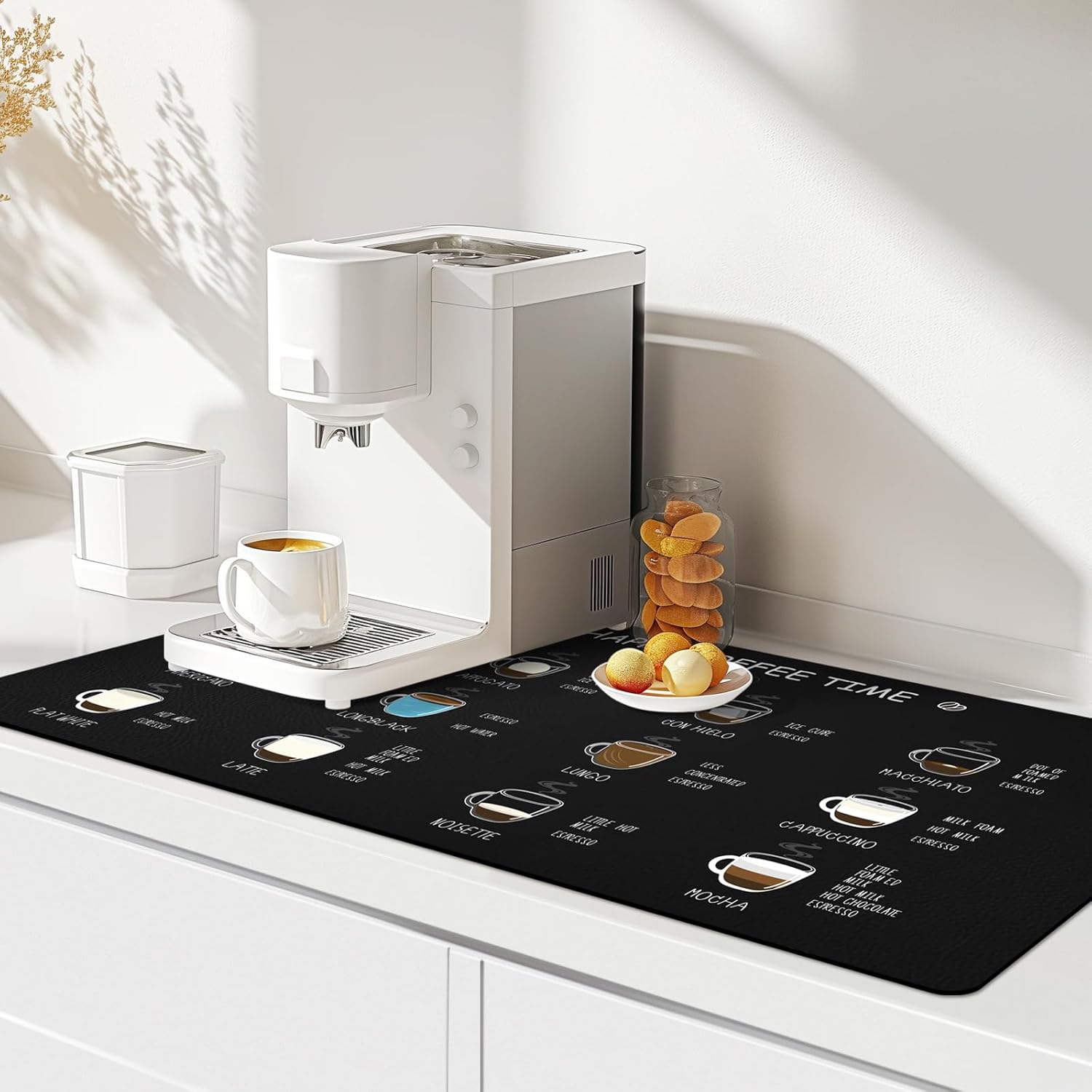 Matace Designer Coffee Bar Mat, Extra Large 17 x 31.5 Inches, Rubber Backing, Absorbent Coffee Maker Mats for Dish Drying, Kitchen Countertop, Coffee Flavor Menu, Black