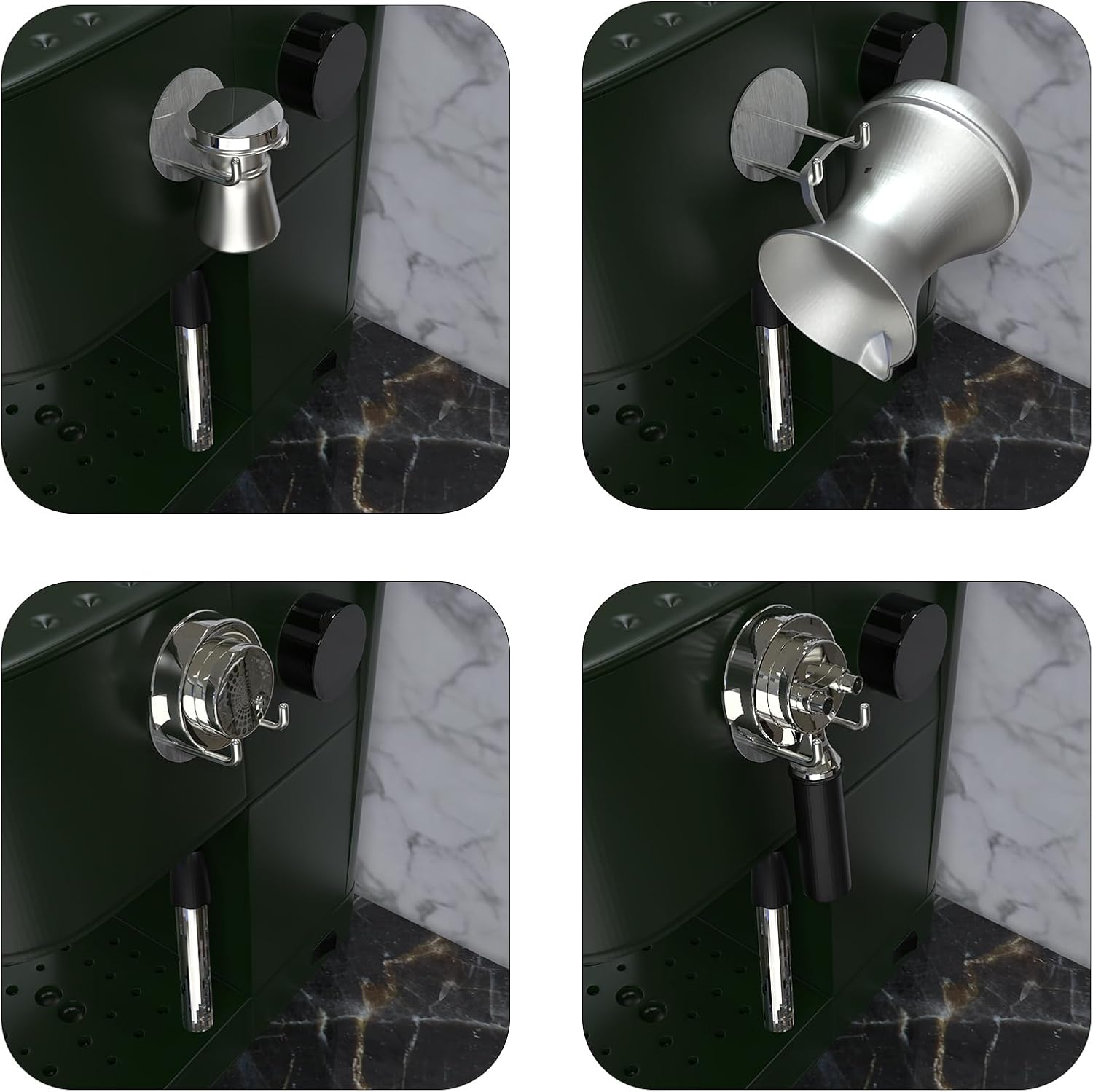 - Wall hanging hooks with a front fence design to prevent the coffee handle from falling out.