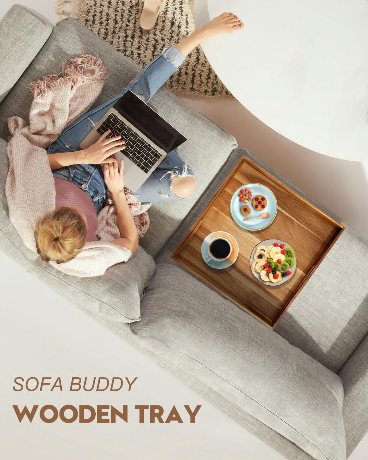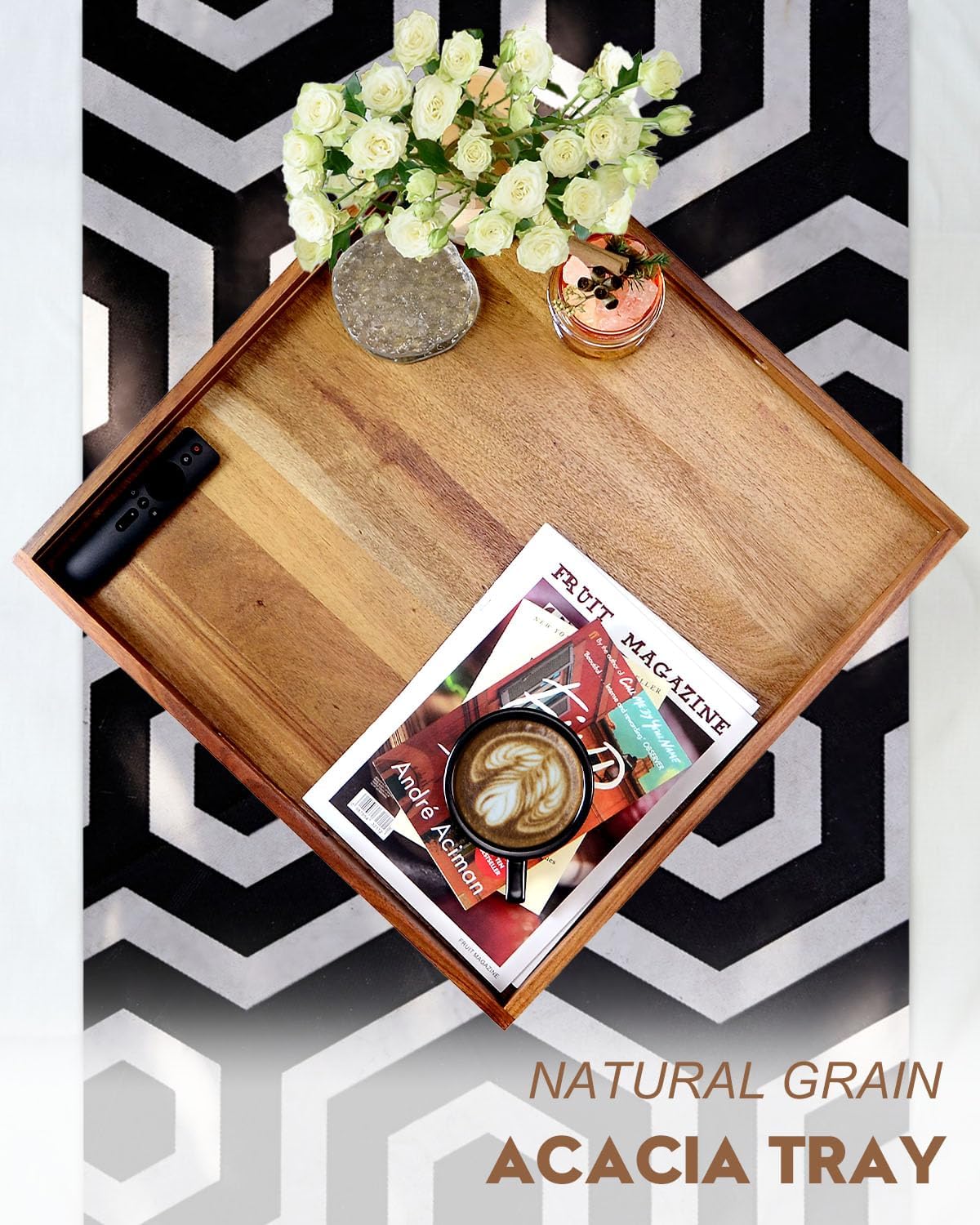 20 Inches Square Acacia Wood Ottoman Tray, Extra Large Wooden Serving Tray with Handles for Living Room, Serving Food Breakfast, Ottoman Coffee Table Couch Sofa Kitchen