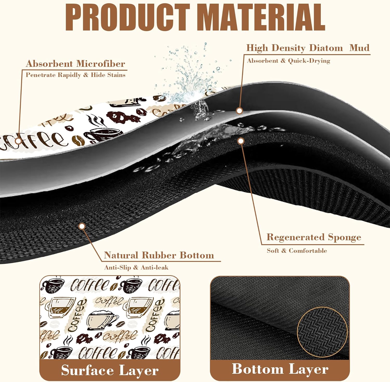- 【Absorbent & Quick-Drying】The surface of this coffee mat is made of absorbent microfiber and the middle is made of composite sponge, which can absorb up to 4 times its weight in water and has a strong water absorption capacity. The high-density design makes it fast drying and can quickly absorb spilled liquids to keep your counter or desktop dry