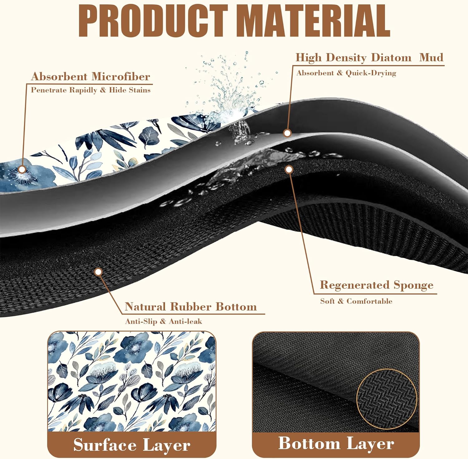 Blue Flowers Dish Drying Mat for Kitchen Counter Coffee Mat Hide Stain Absorbent Dish Drainer Rack Pad with Non-Slip Rubber Backed Espresso Machine Coffee Bar Accessories 11.8 x 19.7 Inch
