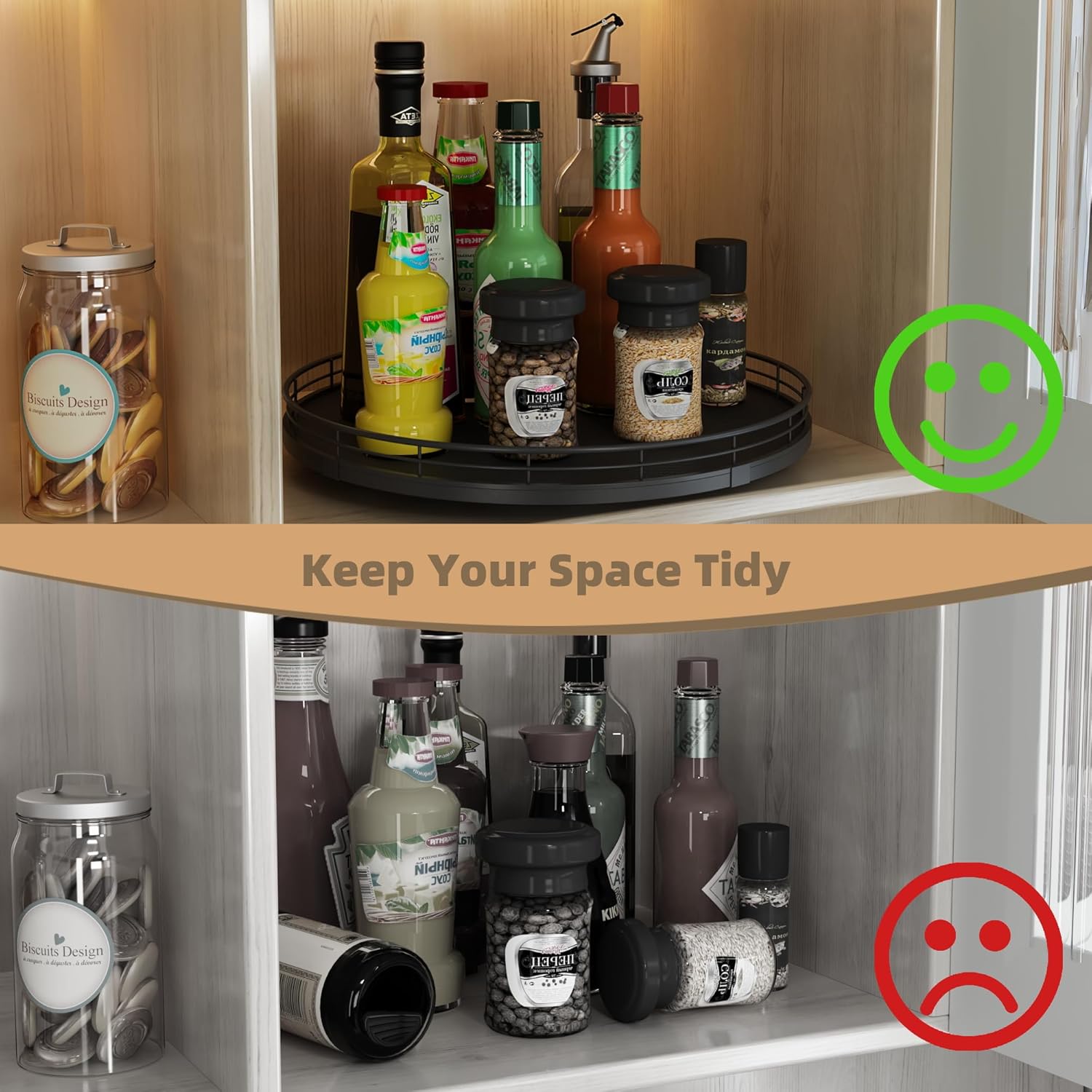 - 360°Smooth Rotation - The lazy susan turntable rotates smoothly and silently, placed next to the stove for easy access to condiments, spices, olive oil and cooking supplies. Placed next to the sink to display soap lotion. Thoughtful kitchen countertop organizers to rid your life of clutter!