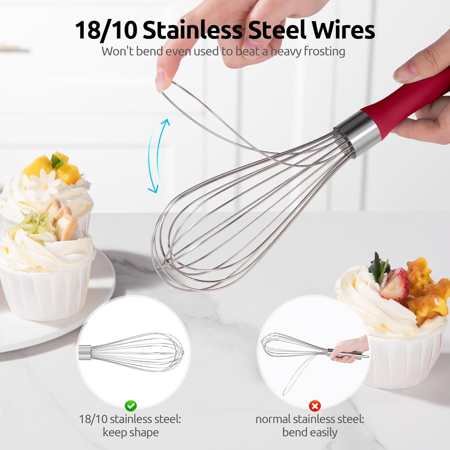 - [18/10 Stainless Steel Wires and Silicone Handle] The 18/10 stainless steel wires are sturdy, rust resistance. They will not bending in your pancake batter and it also holds up to even the thickest of batters and frostings. The food grade silicone handle offers a comfy and non-slip grip and the silicone texture for holding tight with potentially wet hands. This dishwasher safe whisk has the right balance of size and weight. You can rest it in a bowl and it doesn’t flip out.