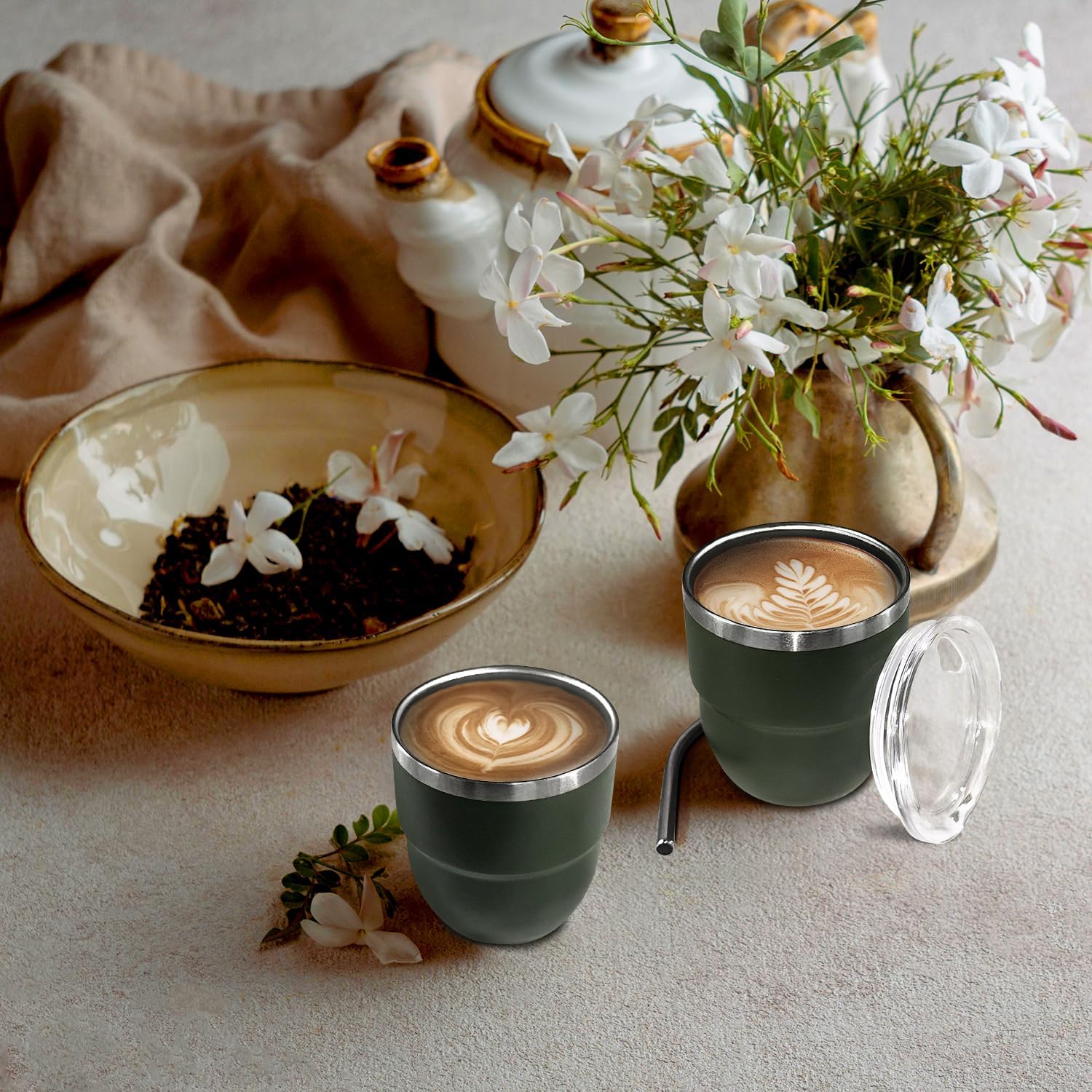 4oz Stackable Cup, Vacuum Insulated Espresso Cup Set of 2, Espresso Shot Glass for Coffee, Double Wall Stainless Steel Mini Tumbler Shot Glasses with Straw and Lid (A-green2P, 4oz)